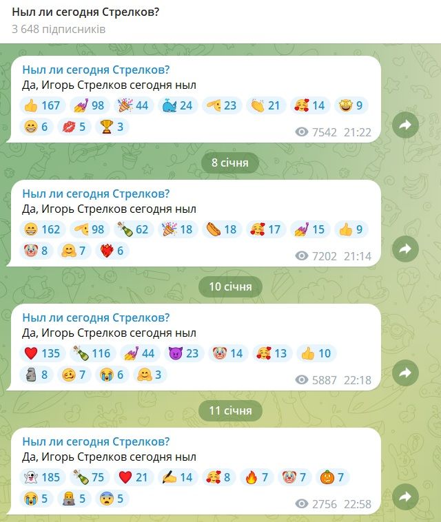Впрочем, по оценке журналистов, с середины октября критика российского руководства убавилась. По информации близкого к Кремлю Телеграм-канала Mash в это время против канала Стрелкова и еще восьми телеграмм-каналов военкоров началась проверка в связи с "фактами дискредитации армии РФ".