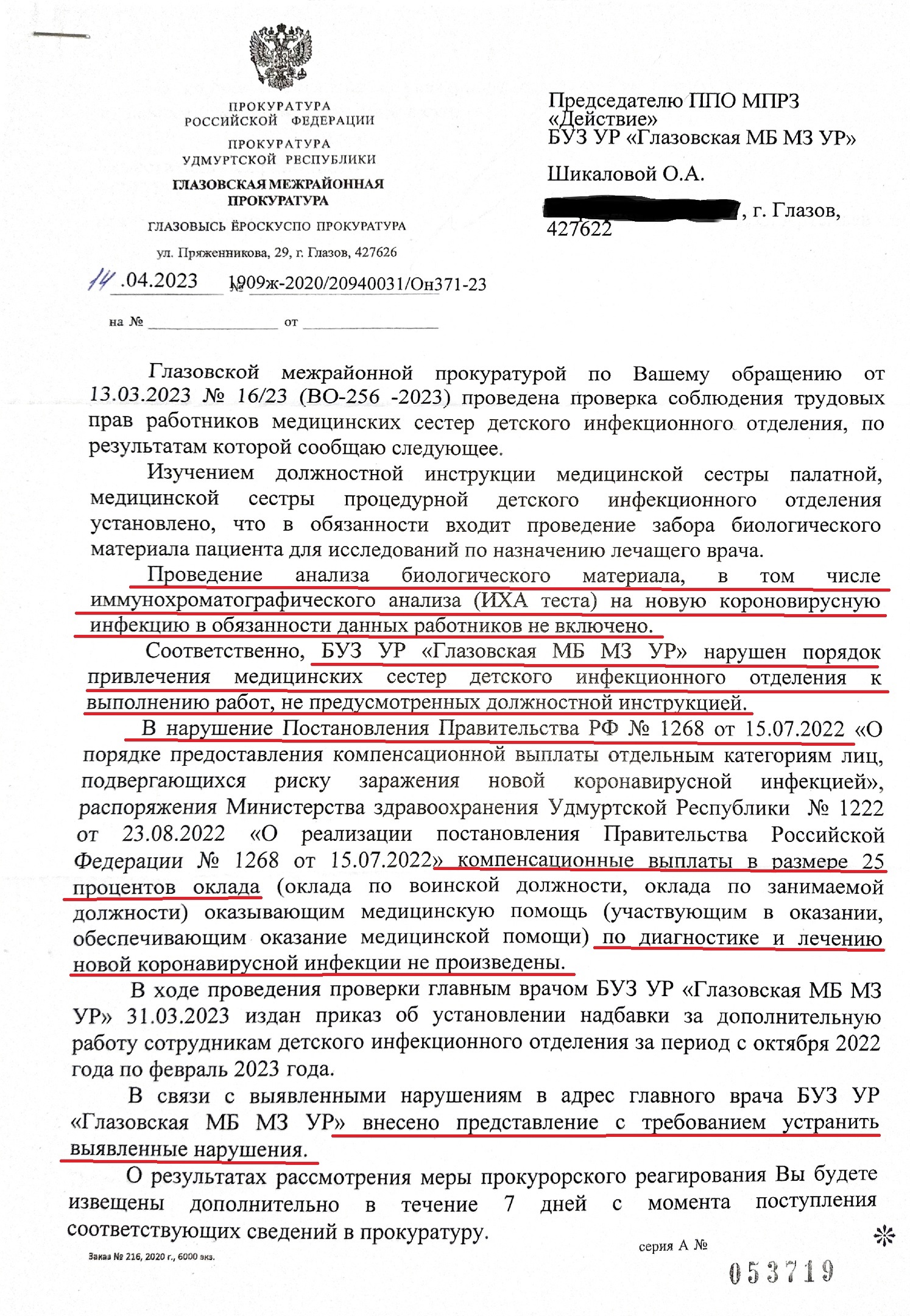 В рамках продолжающейся кампании по отстаиванию трудовых прав медицинских сестер детского инфекционного отделения Глазовской межрайонной больницы профсоюзом "Действие" было выявлено нарушение трудового законодательства в виде привлечения к обязанностям, которые не указаны в должностных инструкциях. Естественно, как у нас это общепринято, сами медицинские работники выполняли эти обязанности "за бесплатно". Речь касается проведения анализа биологического материала (ИХА) на COVID-19 в период с октября 2022 года по февраль 2023 года.