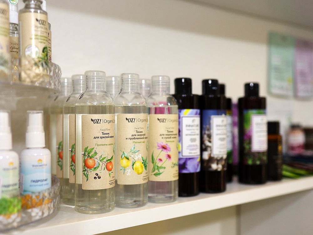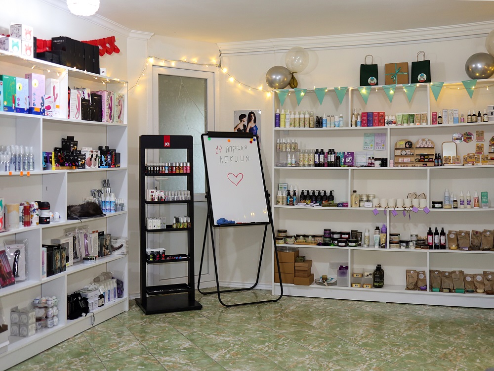 Магазин делится на две части: интимные товары и self-care-продукция — органическая косметика, свечи, масла, керамика.