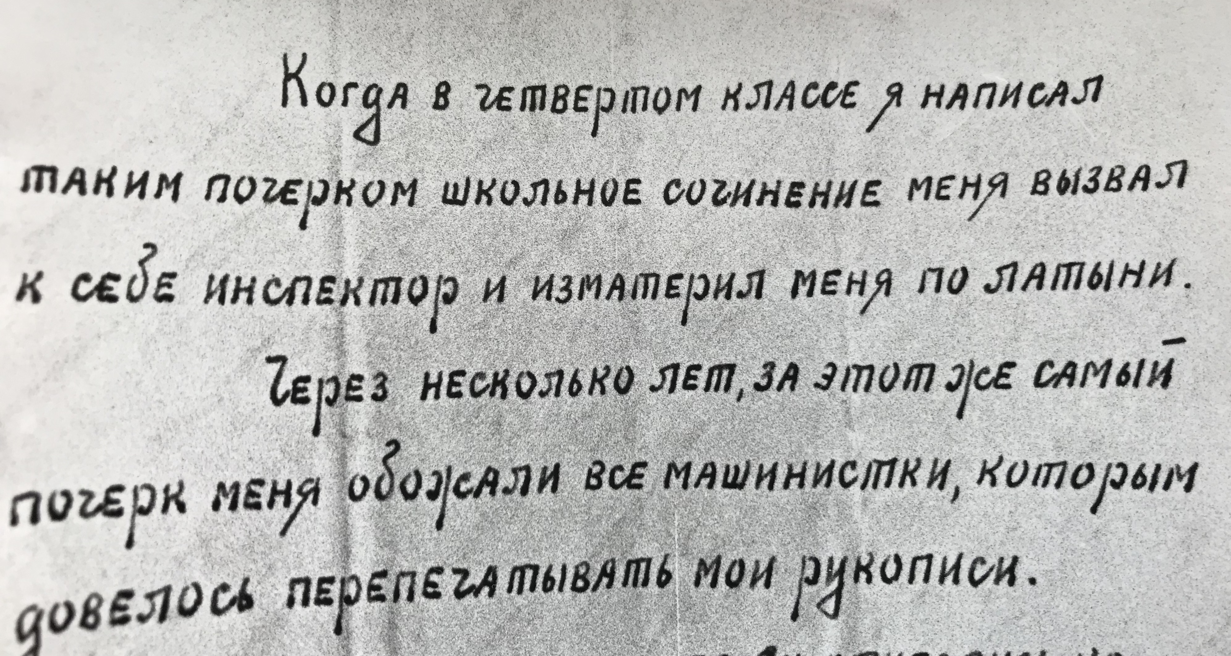 Письмо Эрдмана – образец его знаменитой каллиграфии. "За этот почерк меня обожали все машинистки, которым довелось перепечатывать мои рукописи", – писал он своей жене, московской красавице, балерине Наталье Чидсон.