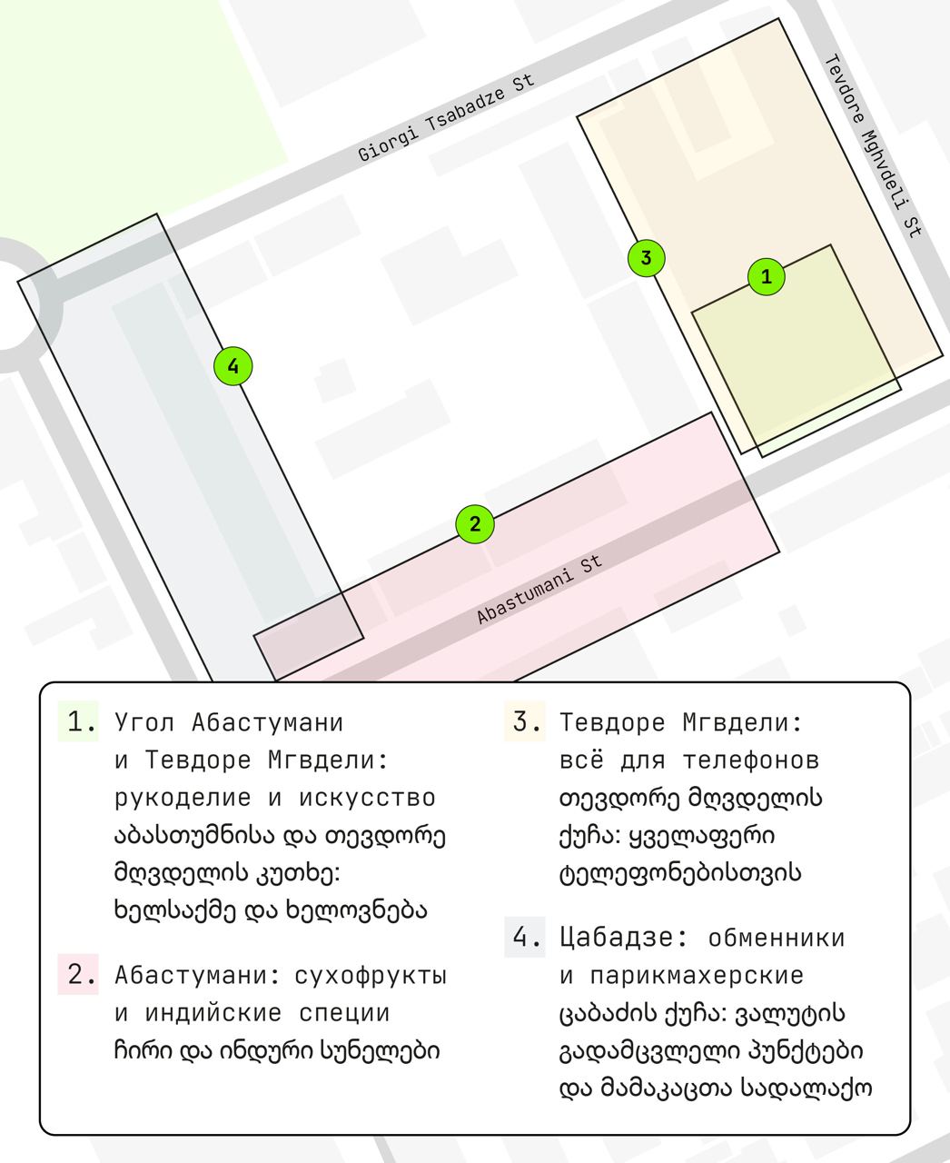 • От Абастумани налево по улице Тевдоре Мгвдели идут бесконечные ряды телефонных лавочек: ремонт всех моделей, зарядки, наушники, колонки и даже взлом. Ремонт делают на совесть — нужно только найти своего мастера. Но ни гарантийного талона, ни чека вам не выпишут.
