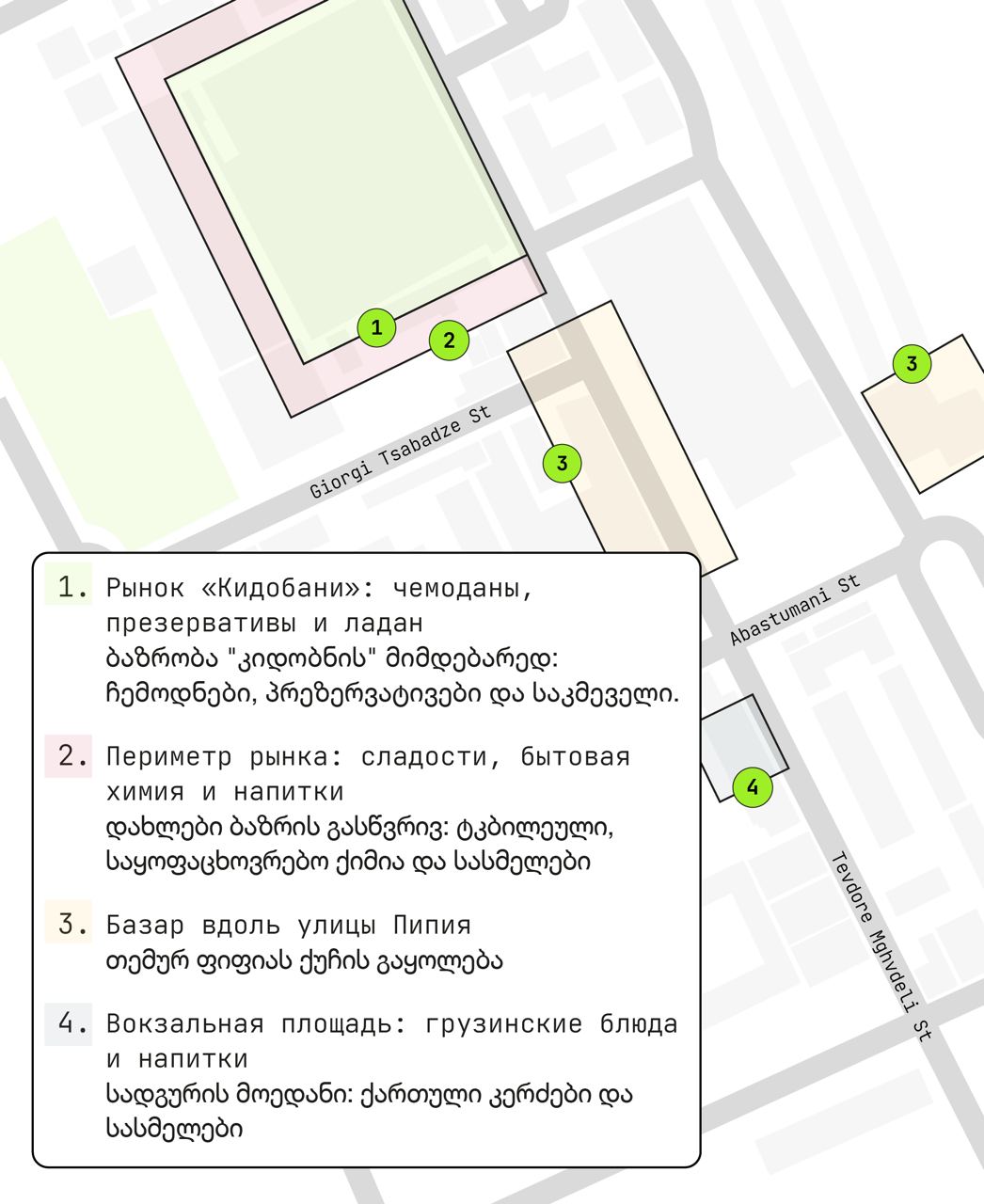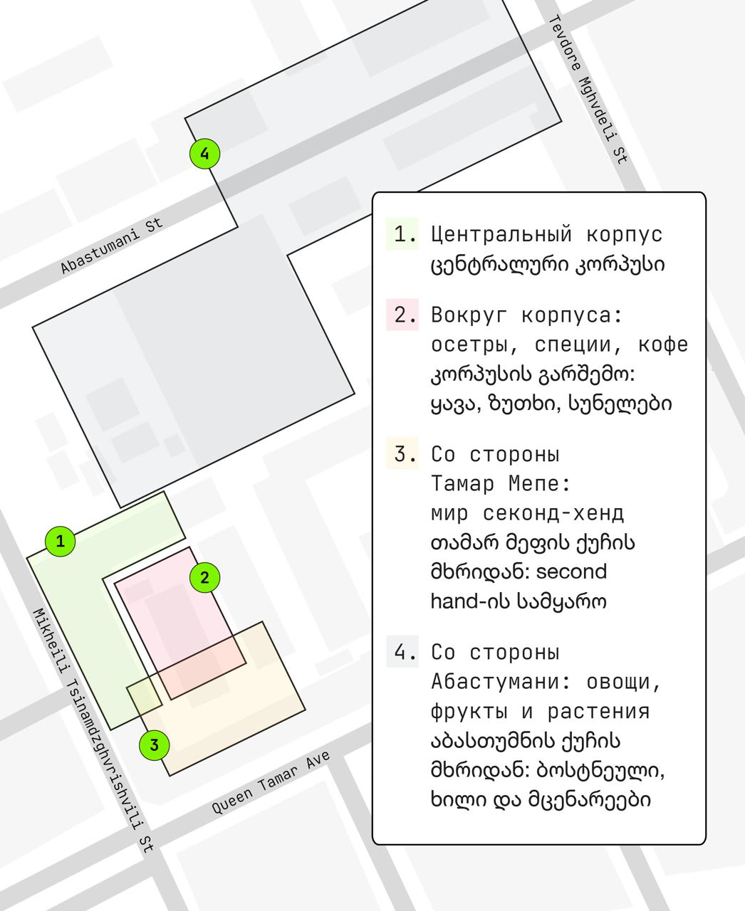 • Начиная от входа в корпус со стороны Тамар Мепе — обувь, одежда, бижутерия, очки. Идти лучше в выходные.