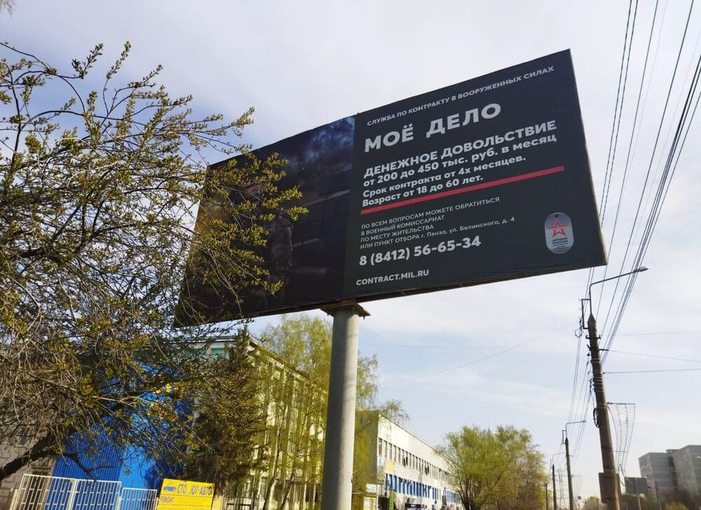 В Пензе наружная милитари-реклама в основном замечена на окраинах города, в спальных районах. Причём если Минобороны указывает конкретные условия службы (денежное довольствие от 200 до 450 тыс. рублей в месяц, срок контракта от 4 месяцев, возраст от 18 до 60 лет), то ЧВК «Вагнер» просто предлагает «вступать в команду победителей».