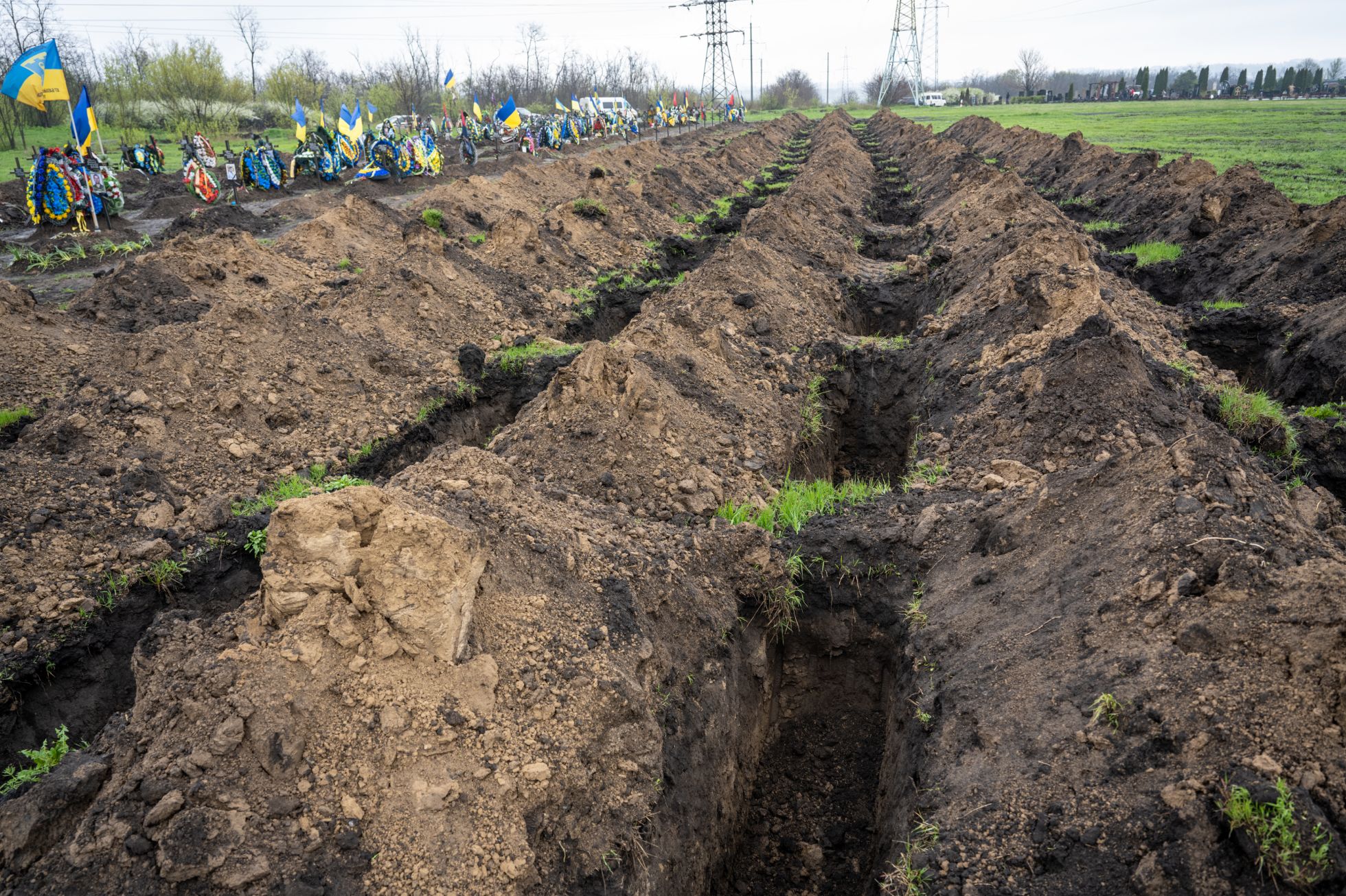 Только за первые три месяца полномасштабного вторжения России в Украину на военном кладбище в городе Днепр похоронили 293 человека — об этом в июне 2022 года писал The Washington Post. По данным военного капеллана Дмитрия Поворотного, за предыдущие восемь лет боевых действий на кладбище появилось 175 могил. На снимке, сделанном 21 апреля 2023 года, видны сразу несколько рядов свежих могил — их вырыли заранее.