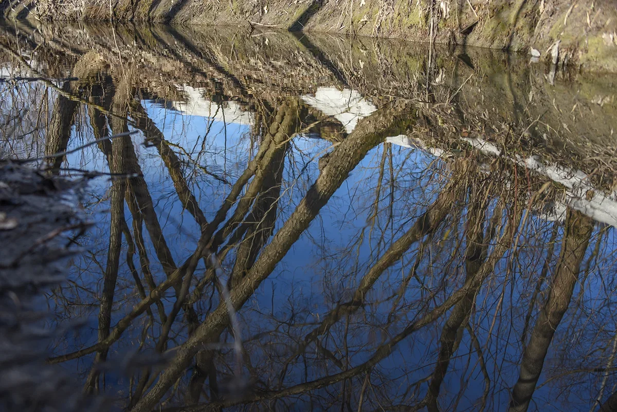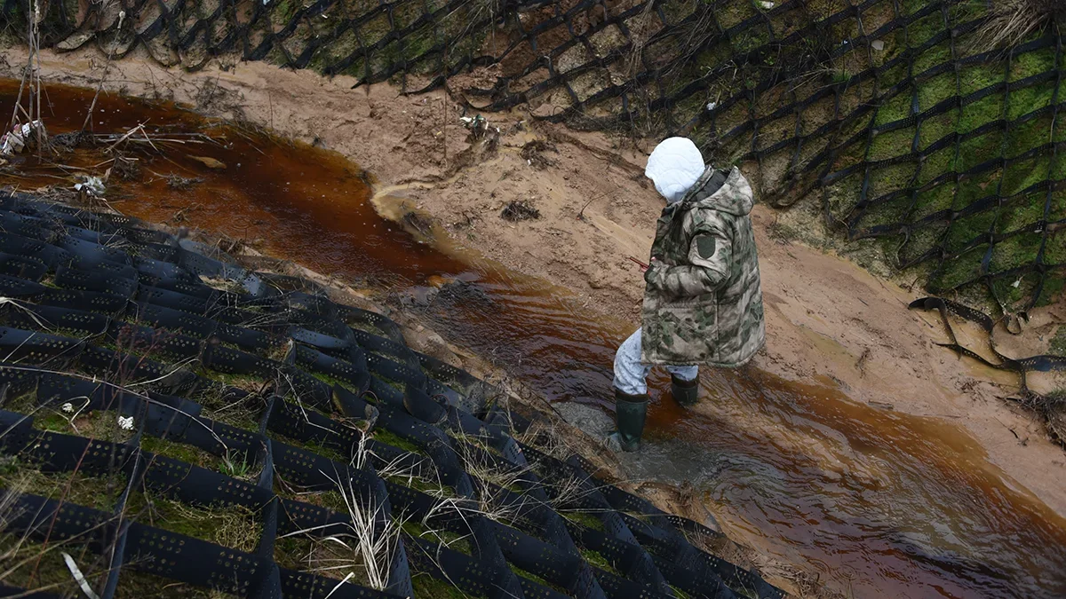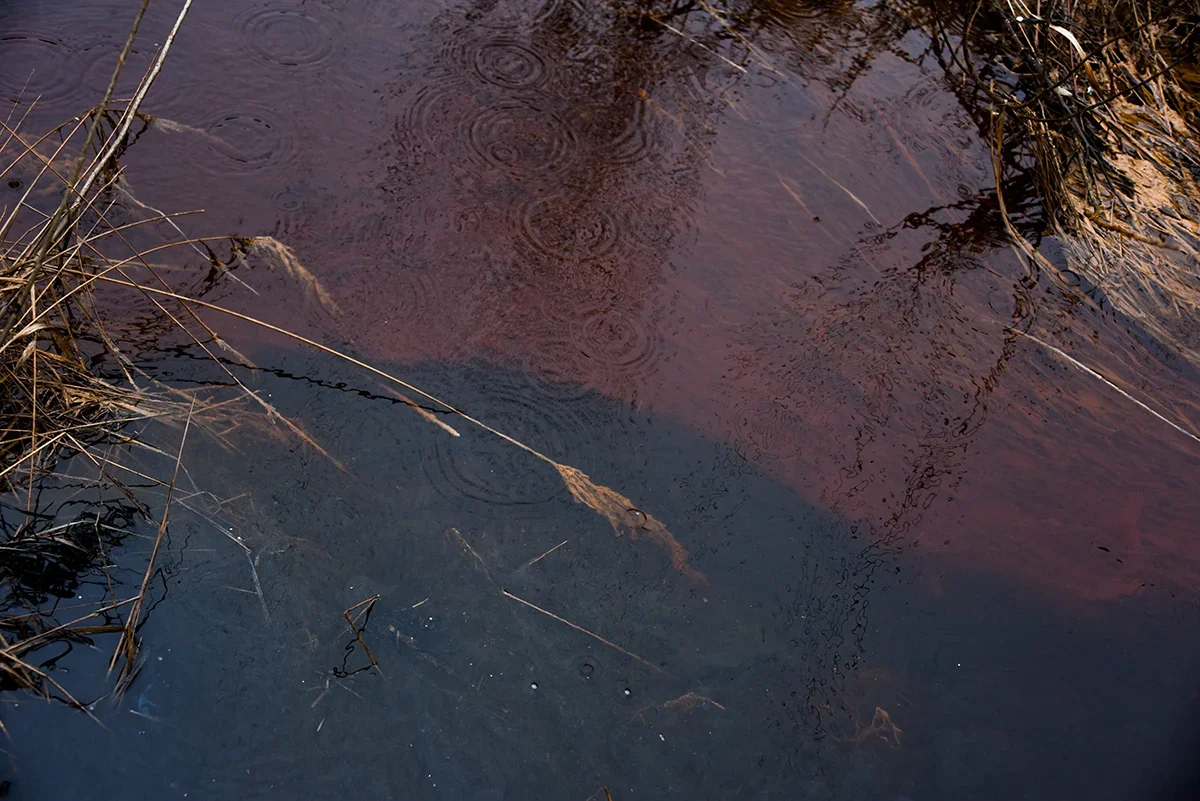 Река Еленка в Храброво. Темный цвет воды появляется благодаря фильтрату — субстанции, которая образуется при гниении твердых бытовых отходов. Фото: Анастасия Цицинова / «Новая газета»