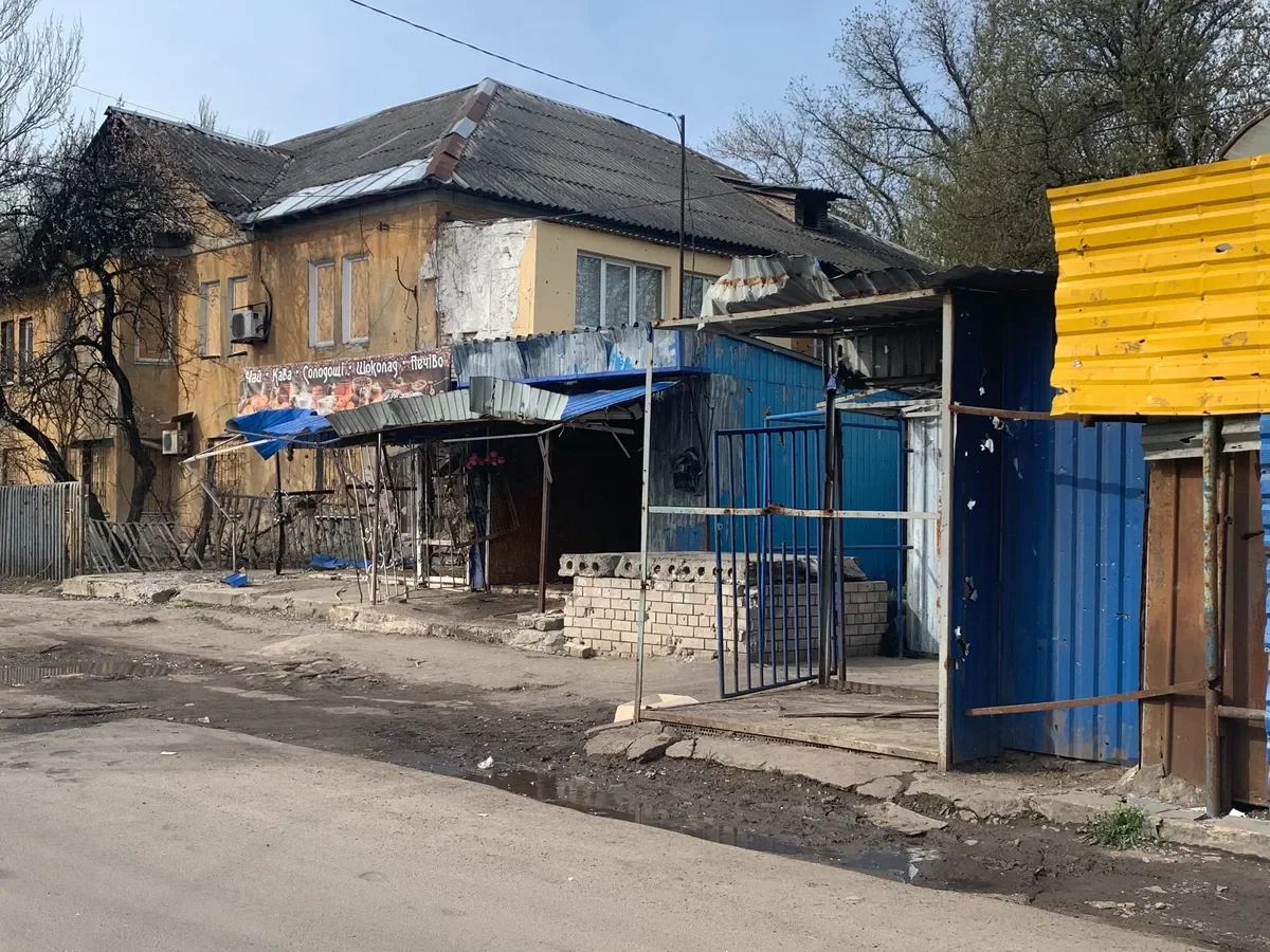 Just around the corner, the consequences of the artillery hit are striking. Only the signboard remains from the shop — “Tea. Coffee. Sweets. Chocolate. Biscuits.” The inside is black. A wreath of artificial flowers was attached to one of the surviving pillars. To my cautious “Has something happened there?” a woman sitting nearby over crates of homemade preserves and bread loaves, looks irritably at my “Press” badge: