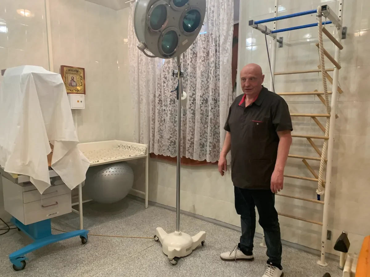 Tsyganok and his colleagues show me a room where a window is blocked by a pile of sandbags; a tulle curtain is draped over them “for aesthetics”. A rack of equipment has been covered with a sheet. A big grey exercise ball is meant to help women in labour relax between contractions. The Swedish ladder wall bars perform the same function. I notice an icon on the switchboard above the table. The head doctor follows my gaze: