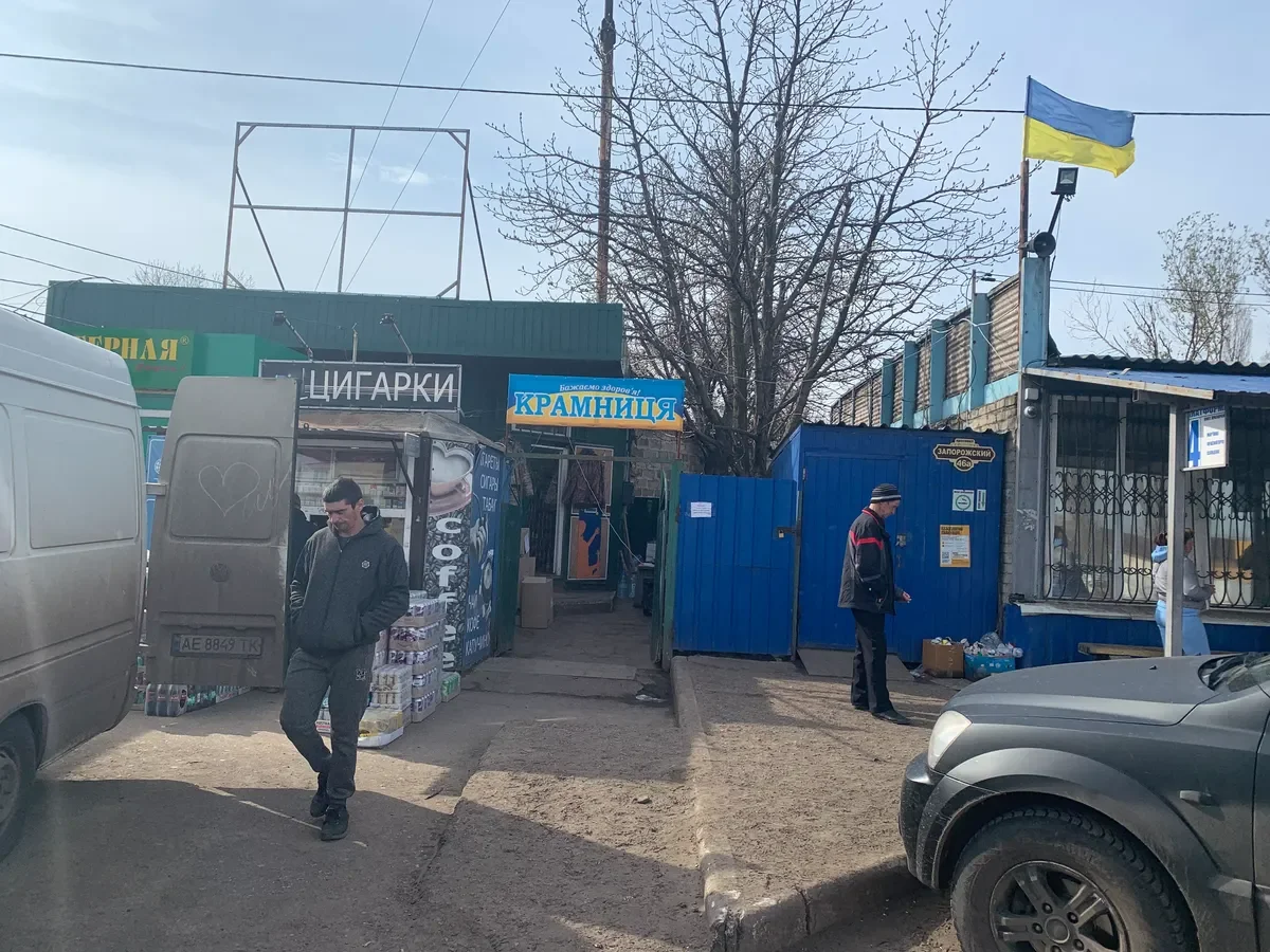 You can see from the rows of market stalls: small businesses are trying to survive somehow, mostly at the expense of the military. A state flag is flying above the tent “trade centre”. On the counters are rubber boots, car tyres, tools for repair, canisters with diesel fuel… People are selling what remains in their garages — anything that’s in demand and has a price.