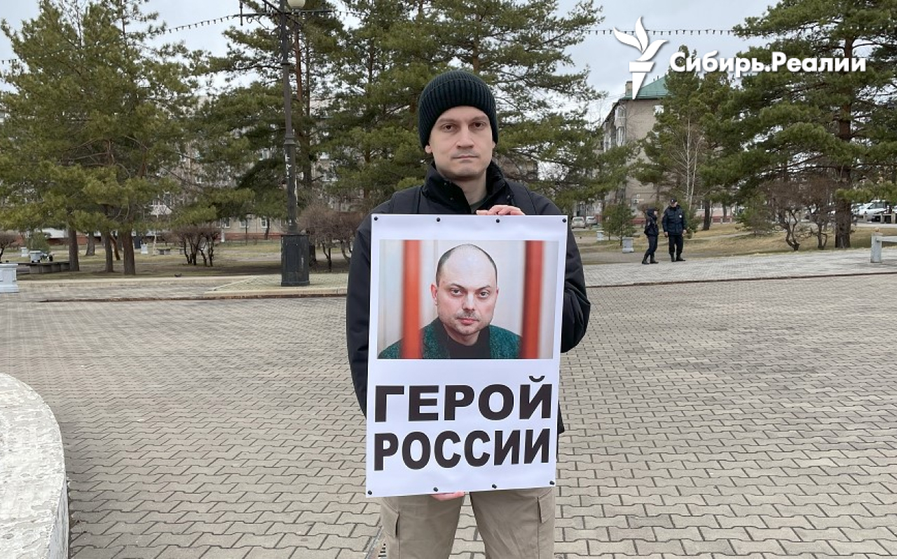 В Хабаровске активист Николай Зодчий провел пикет на площади возле ДК "Русь" в поддержку оппозиционного политика Владимира Кара-Мурзы, осужденного на 25 лет лишения свободы. Полицейские, находившиеся рядом, к пикетчику не подошли, передал корреспондент Сибирь.Реалии.