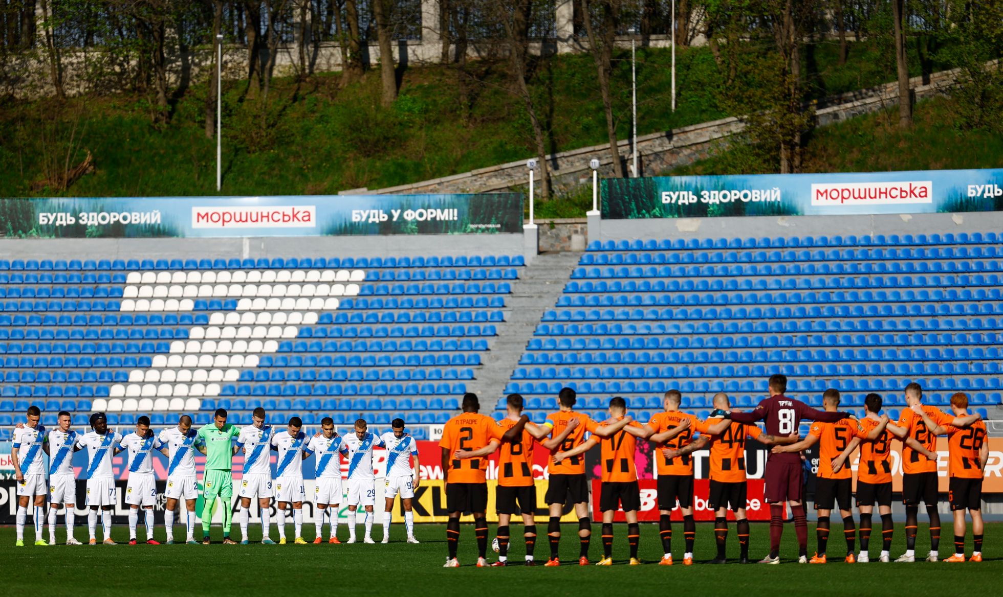 Valentyn Ogirenko / Reuters / Scanpix / LETA Команды «Динамо Киев» и «Шахтер» (Донецк) во время минуты молчания в память погибших бойцов ВСУ перед матчем в Киеве