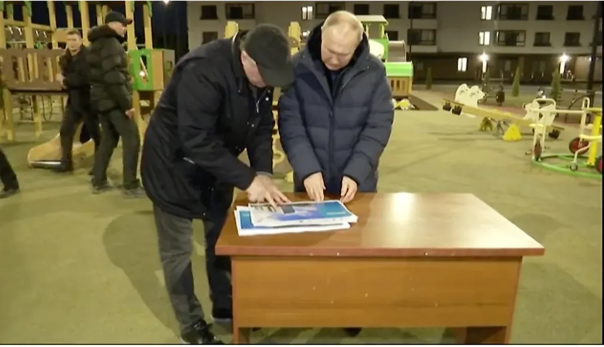 В абсолютно пустынном ночном городе они заходят на детскую площадку. Там — посреди детской площадки! — стоит деревянный канцелярский стол. Хуснуллин выкладывает на стол пачку разрисованных картинок и начинает рассказывать (ночь, стол, пустой город) о триллиардах отремонтированных объектов. Он сообщает Путину, что город снесли украинские нацисты.