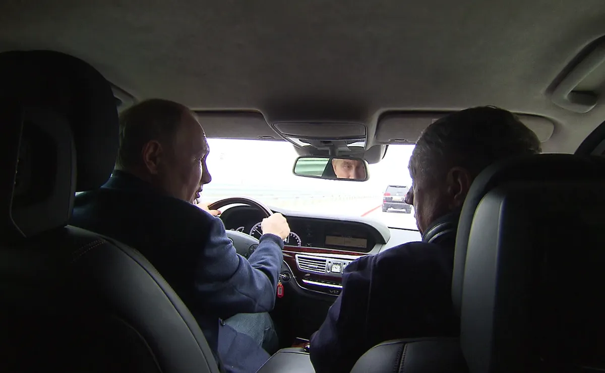 На видео Путин (или человек, на него похожий) едет лично за рулем по мосту, рядом бубнит про восстановление моста вице-премьер Марат Хуснуллин. Оператор с заднего сиденья снимает в основном затылок Путина, и пару раз — его глаза в зеркале заднего вида.