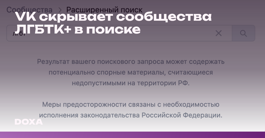 VK перестала показывать сообщества, посвященные ЛГБТК+. При вводе «ЛГБТ», «лесбиянка» или «гей» в строку поиска по сообществам сервис выдает предупреждение о том, что результаты запроса могут содержать «недопустимые» материалы.