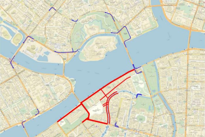- 27 апреля, 4 мая и 7 мая — на набережной Мойки от Невского проспекта до Певческого моста, на Миллионной улице, в проезде вдоль домов 4 и 6–8 по Дворцовой площади, на набережной Зимней канавки, Дворцовой набережной, в Дворцовом проезде, на Адмиралтейском проспекте от Гороховой улицы до Невского проспекта, на Адмиралтейской набережной и Невском проспекте от Садовой улицы до Дворцового проезда.