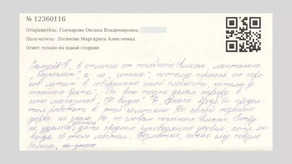 Его интерес к племянникам вспыхнул после случившейся трагедии. Пётр Самусёв, в отличие от покойного Алексея, ментально «бизнесмен», а не «гопник», поэтому перечень его пороков лежит совершенно в иной плоскости, нежели у покойного брата. Он всю жизнь делал карьеру в сети магазинов «М‑Видео». В Анапе вроде бы продолжил работать в этой компании. До какой позиции дорос — не знаю. Но, по словам покойного Алексея, Петру не удалось достичь даже среднего руководящего уровня, хотя он всегда об этом мечтал. Возможно, сейчас ему повезло больше, не знаю.