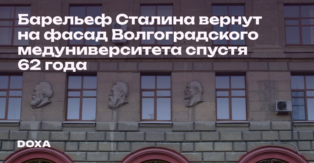 Барельеф Сталина, располагавшийся на фасаде здания Волгоградского медуниверситета, вернут на прежнее место. Барельеф был удален с фасада в 1961 году в рамках развенчания культа личности. Об этом сообщила пресс-служба вуза.