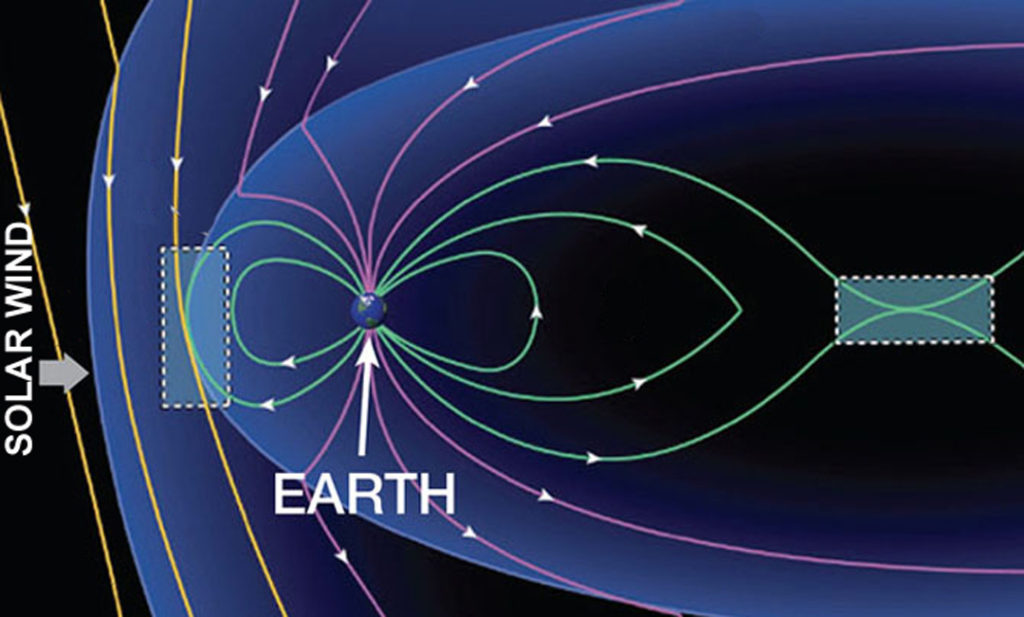 Благодаря этим пересоединениям электроны разгоняются до 35 тысяч километров в секунду и летят вдоль магнитного поля — к магнитным полюсам, где силовые линии сходятся вместе, становятся «гуще» и уходят в недра Земли. С дневной стороны, где электроны разгоняются в зоне ударной волны, электроны тоже приходят, но там их энергия обычно ниже.