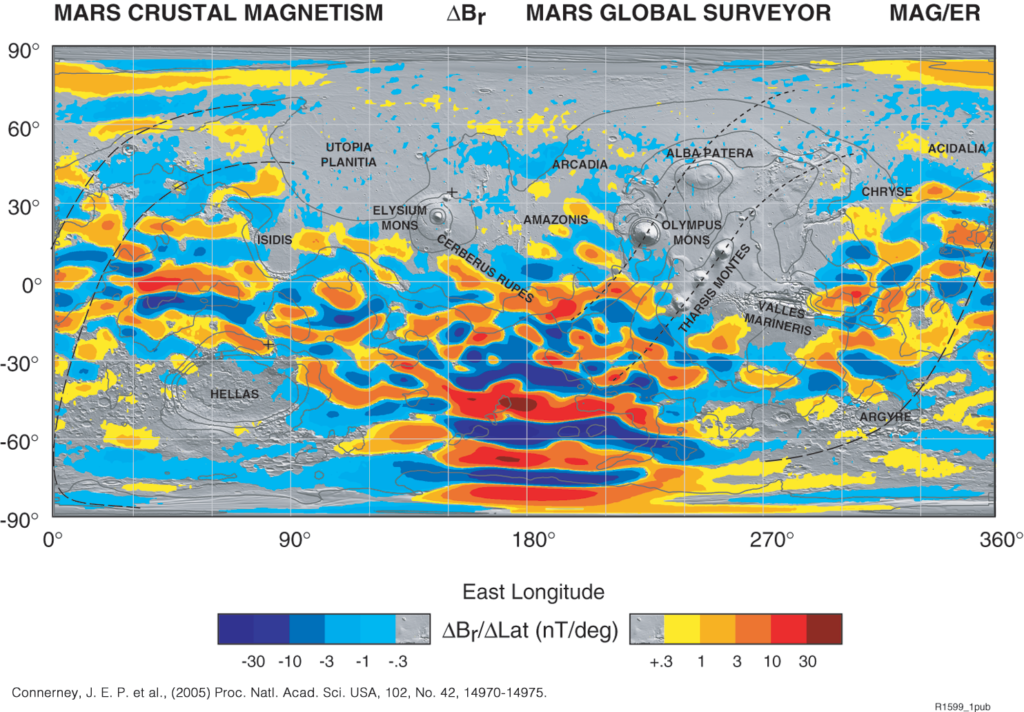 У Марса нет глобального магнитного поля, ядро этой планеты не генерирует его, хотя так было не всегда. Остаточная намагниченность марсианской коры указывает, что в прошлом — примерно 4 миллиарда лет назад — полноценное магнитное поле у Марса все-таки было, но сейчас от него остались только намагниченные «пятна», где в самых намагниченных местах напряженность поля не превышает 2 микротесла.