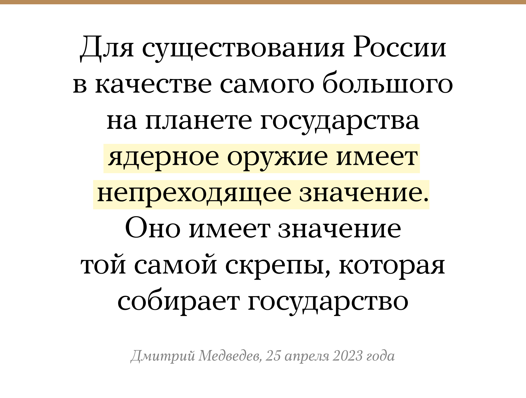 Заместитель главы Совбеза РФ Дмитрий Медведев в очередной раз пригрозил применением ядерного оружия, которое он считает «скрепой, собирающей государство». Выступая на просветительском марафоне «Знание. Первые», Медведев заявил, что Россия может первой применить ядерное оружие, если в отношении нее будет проявлена агрессия, грозящая существованию государства. Он добавил, что противники Москвы не должны недооценивать такие риски. «Скажем прямо, если в твоих руках есть какое-то оружие, а я, как бывший президент, знаю, что это такое, ты должен быть готов в определенной ситуации к тому, что у тебя не дрогнет рука его применить, как бы чудовищно и жестоко это не звучало», — сказал Медведев.