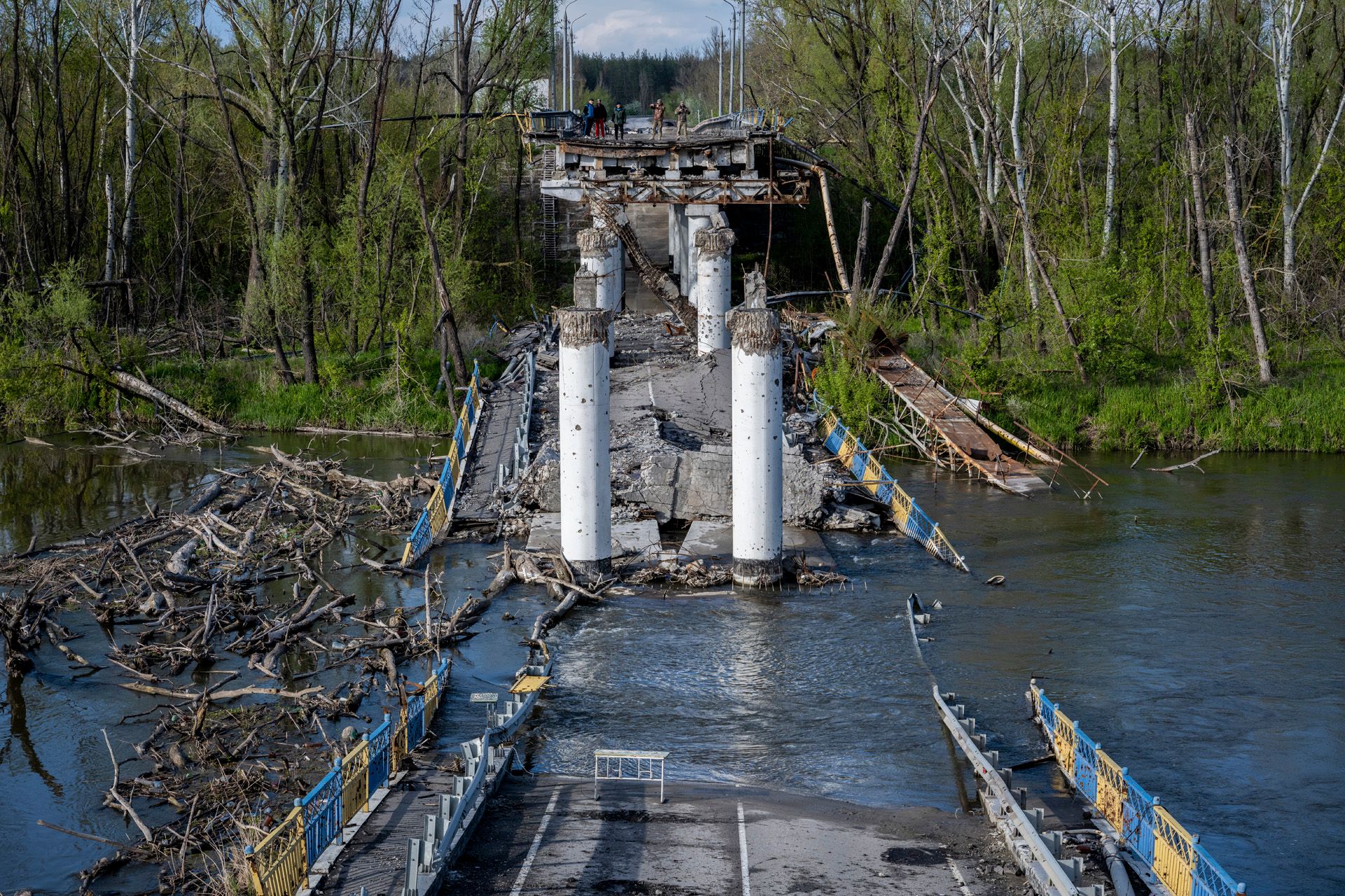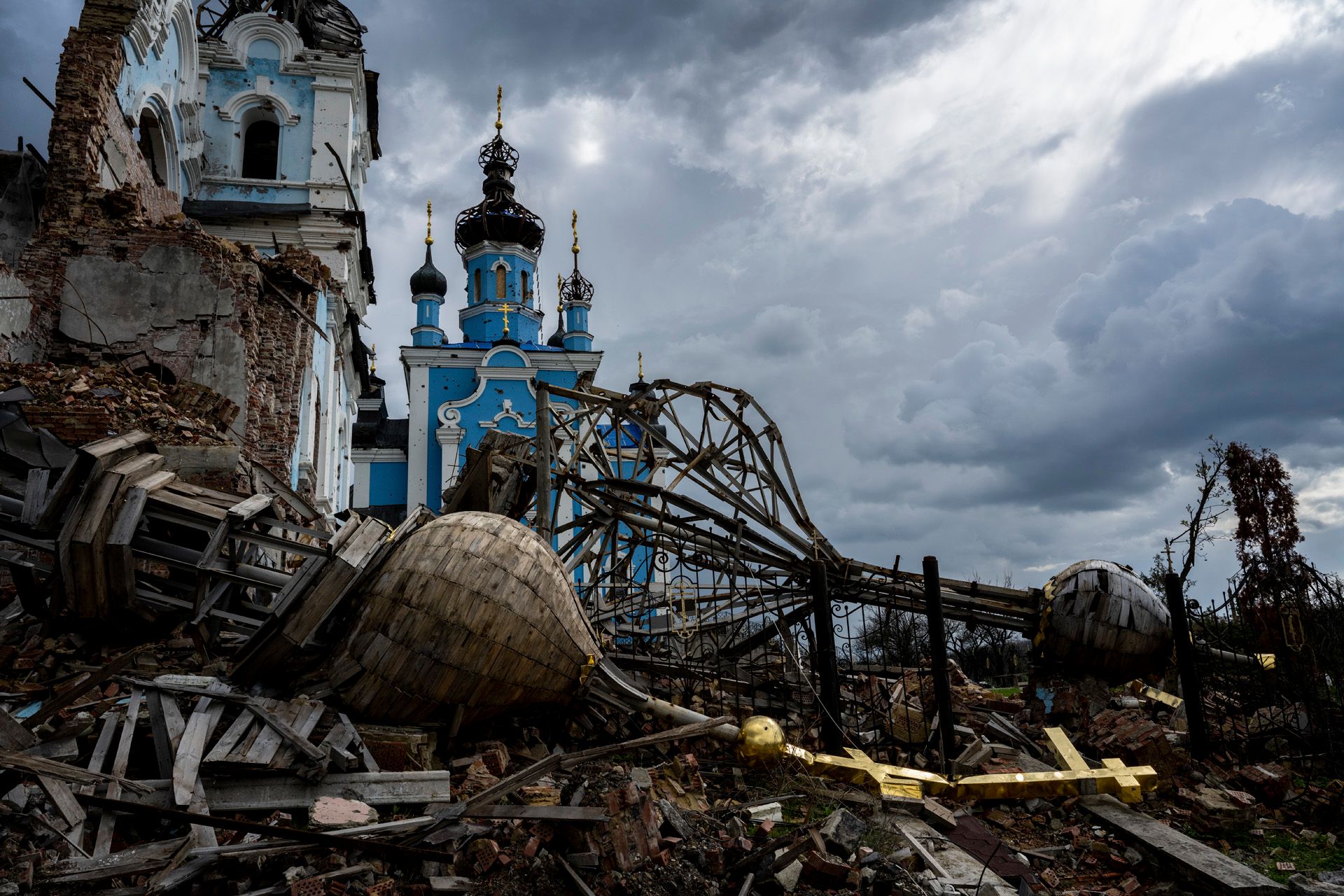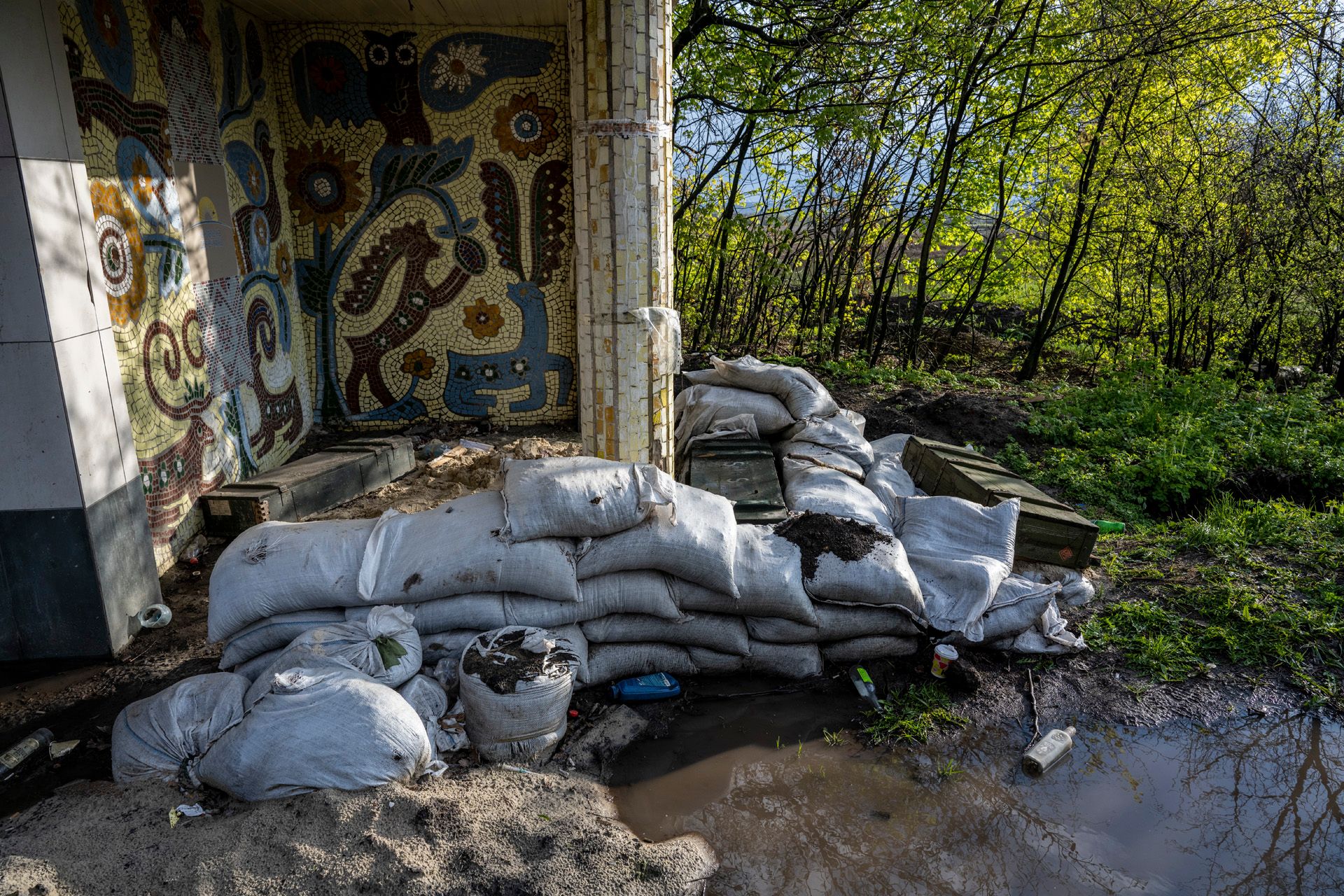 Scott Peterson / Getty Images Обрушившиеся купола церкви Пресвятой Богородицы в селе Богородичное, которое находится примерно в 20 километрах от Славянска Донецкой области. С начала полномасштабного вторжения рядом с Богородичным шли тяжелые бои — село переходило «из рук в руки» 14 раз (сейчас оно находится под контролем ВСУ). До войны в нем жили около 800 человек — сейчас в практически полностью разрушенном Богородичном всего семь жителей, которые не хотят эвакуироватьсяScott Peterson / Getty Images Мешки с песком на автобусной остановке в БогородичномScott Peterson / Getty Images Разрушенный мост через реку Северский ДонецScott Peterson / Getty Images Жительница Богородичного Любовь у своего разрушенного домаScott Peterson / Getty Images Закрашенный дорожный знак рядом с Богородичным. Украинцы закрашивают указатели, чтобы сбить с толку российские войска