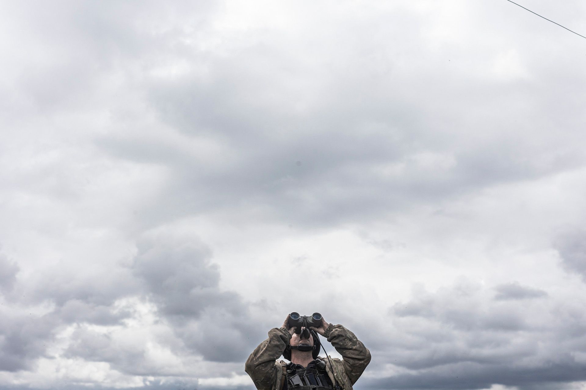 Кадр дня. Солдат ВСУ следит за российскими дронами