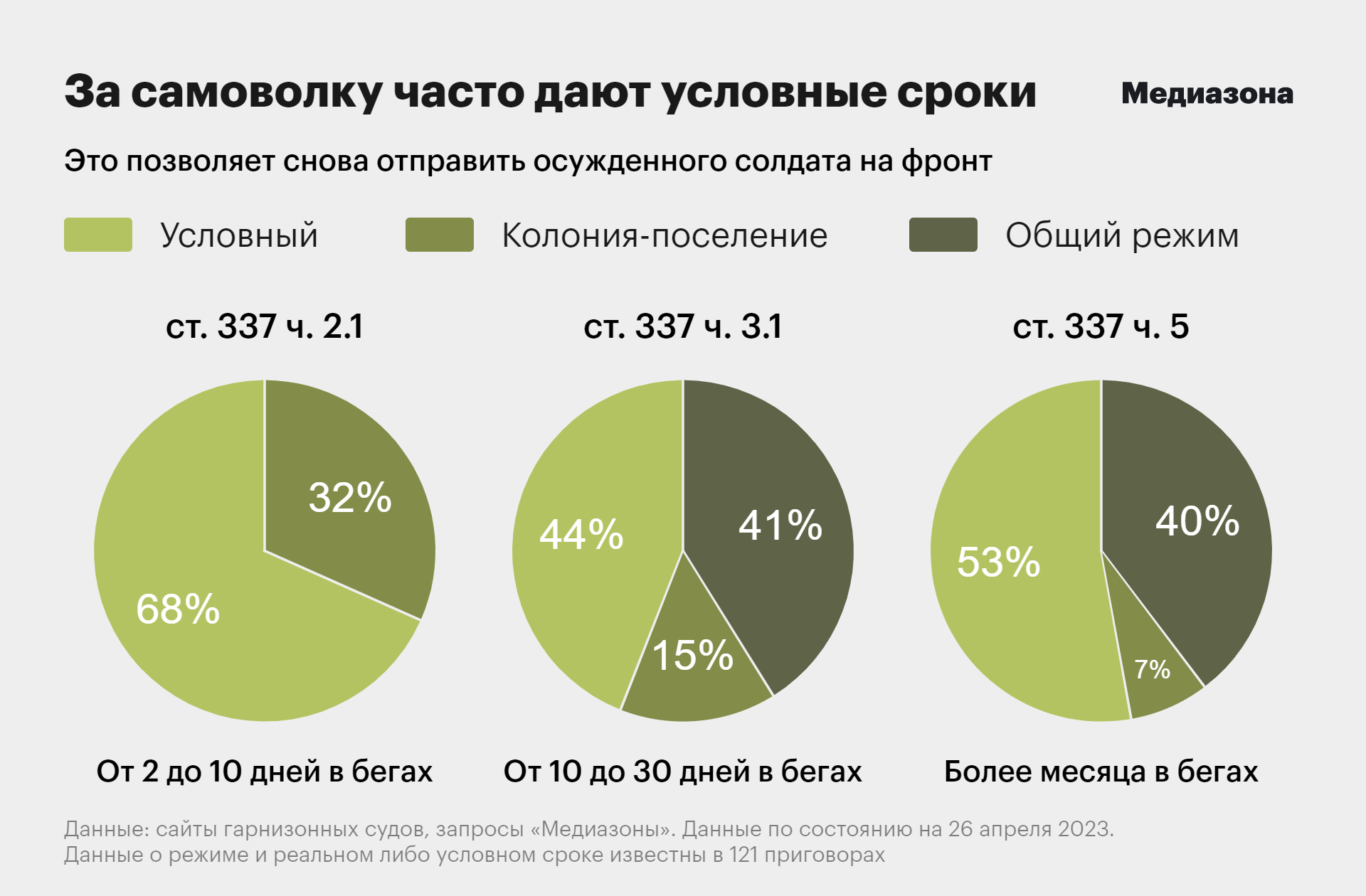 «Медиазоне» удалось выяснить результат рассмотрения лишь в каждом пятом завершенном деле о самовольном оставлении части, большинство таких судов заканчиваются условным сроком. В соответствии с указом президента Владимира Путина о мобилизации, осужденные к условному сроку военные могут быть возвращены на фронт.