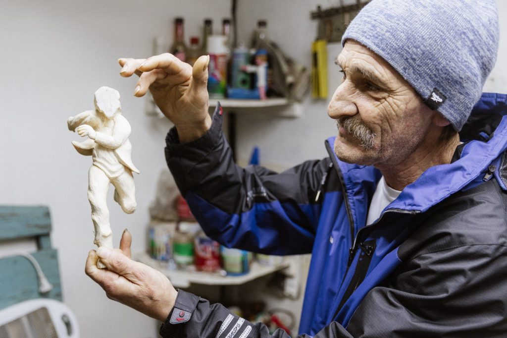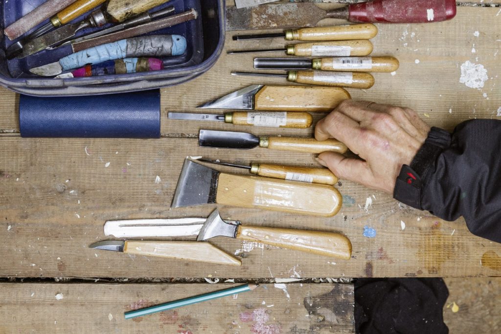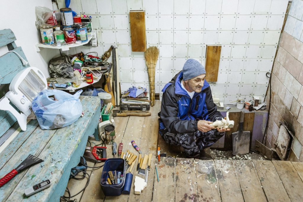 В мастерской почти ничего нет: скамейка, пара угловых полок, небольшой станок для распила дерева на заготовки и одна-две фигуры, над которыми сейчас идёт работа. На полках стамески, наждачная бумага, краски и резачки – маленькие, сверхострые, с деревянными ручками, разной формы, ширины, толщины и длины. Для обработки дерева многого не нужно, пожалуй, весь ходовой инструмент Перевалов сможет собрать в одну руку.