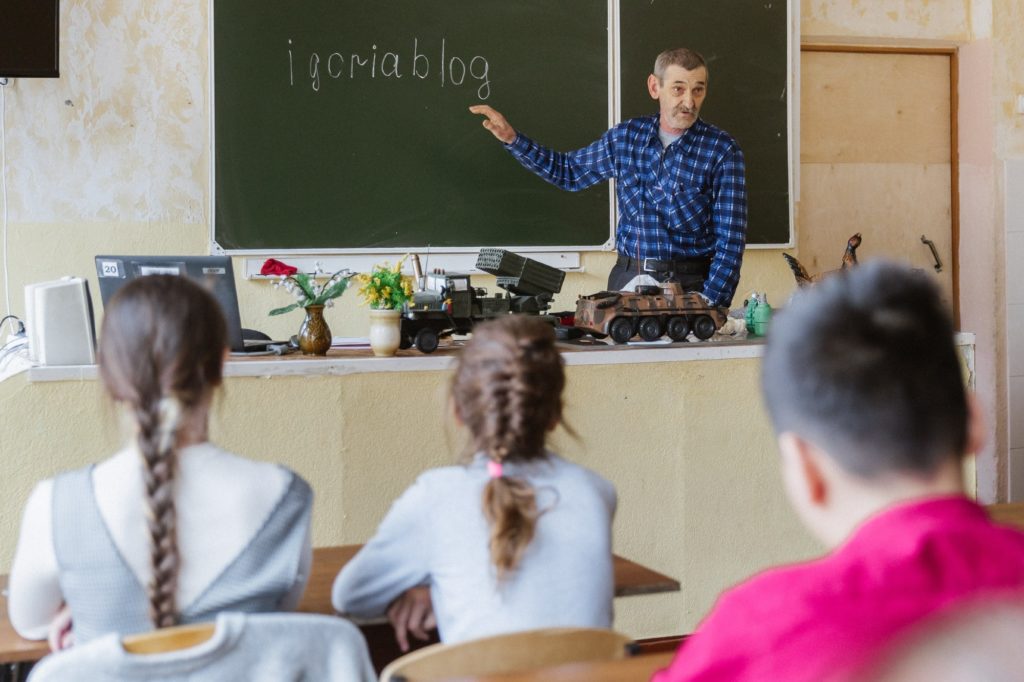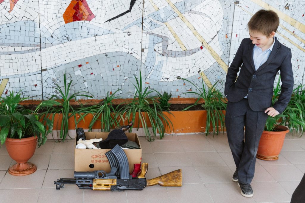 Перевалов захватил в школу коробку оружия, пару готовых скульптур и одну наполовину готовую работу. Всё это разложил на большом учительском столе, пообещал, что автоматы можно будет взять в руки. Узнав о том, что перед ними блогер-стотысячник, которого упоминал Гарик Харламов, пятиклашки дружно достали смартфоны и подписались на "Инстаграм", "Тик-ток" и ютюб-канал Перевалова.