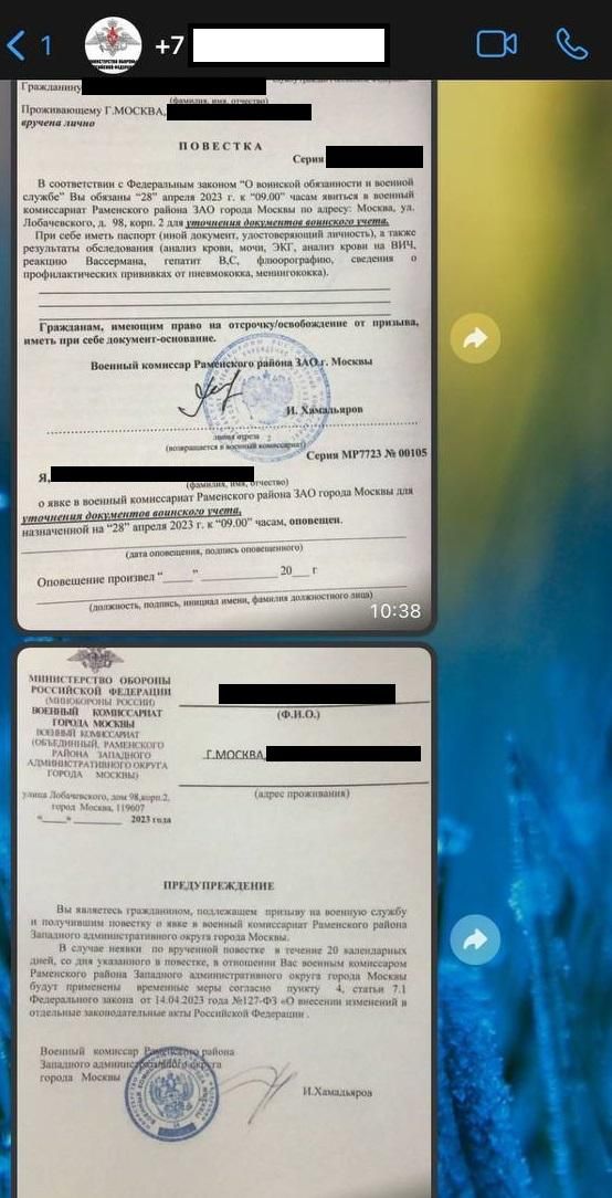 В Москве начали рассылать повестки по WhatsApp. Сообщение с фотографией повестки в военкомат получила мама одного из жителей Москвы. Об этом он рассказал DOXA.
