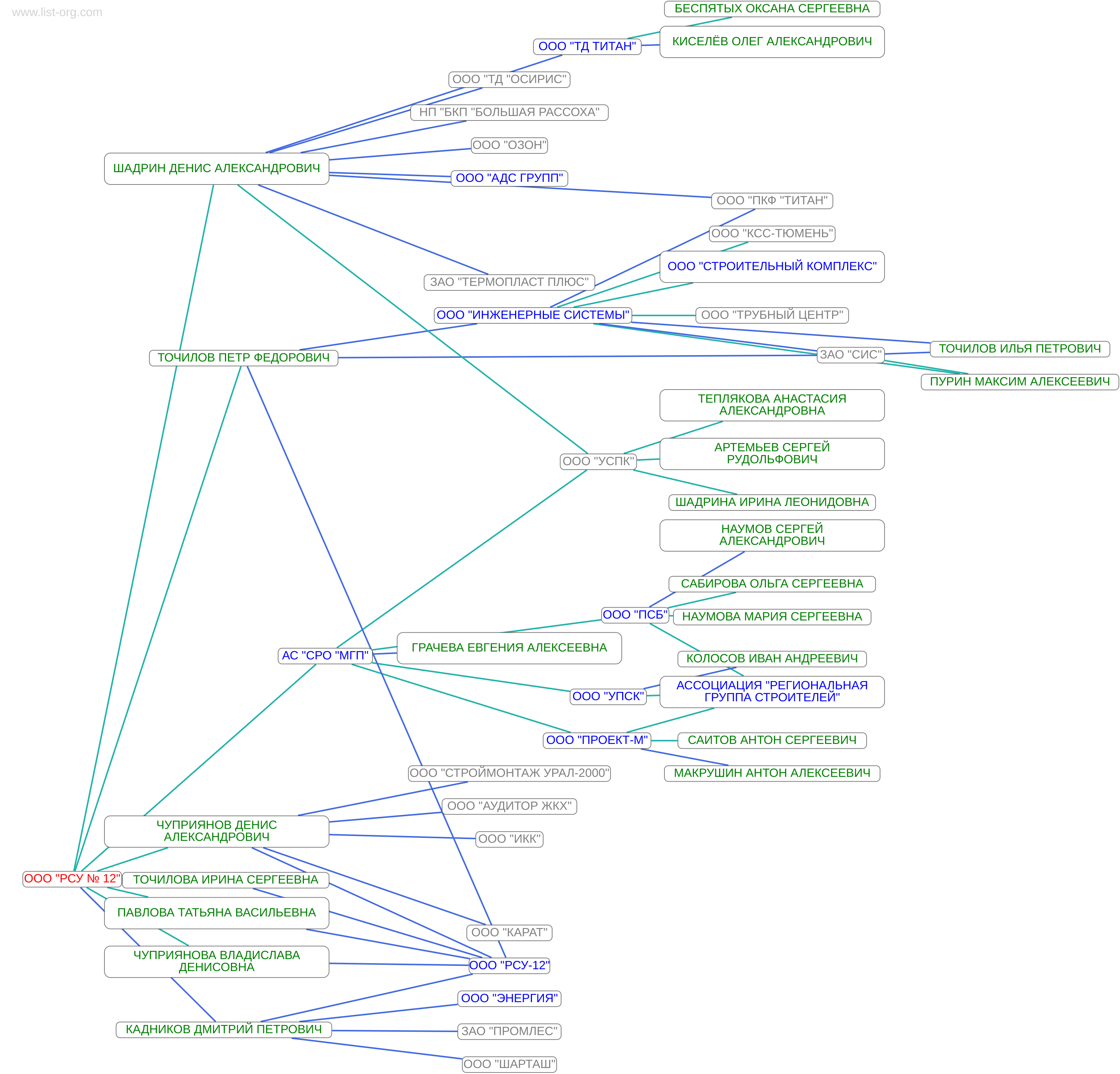 Фирма создана в марте 2018 года, имеет трех учредителей. Только за первых полтора года своего существования предприятие успело получить без конкурса госконтракты на общую сумму 551,723 млн рублей, более поздние данные засекречены в связи с санкционными рисками. В 2019 году был создан «клон» с различием в названии всего в одну букву – ООО «РСУ-12», которое также «кормится» на бюджетных подрядах. Дерево связей ООО «РСУ №12» очень разветвленное.