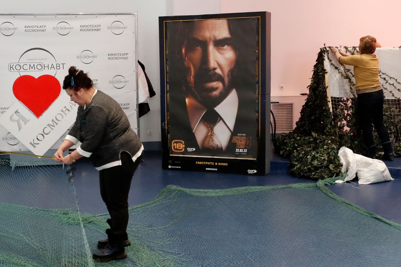 Анатолий Мальцев / EPA / Scanpix / LETA Российские волонтеры движения «Тепло наших рук» рядом с постером фильма «Джон Уик — 4» делают маскировочные сетки для военных