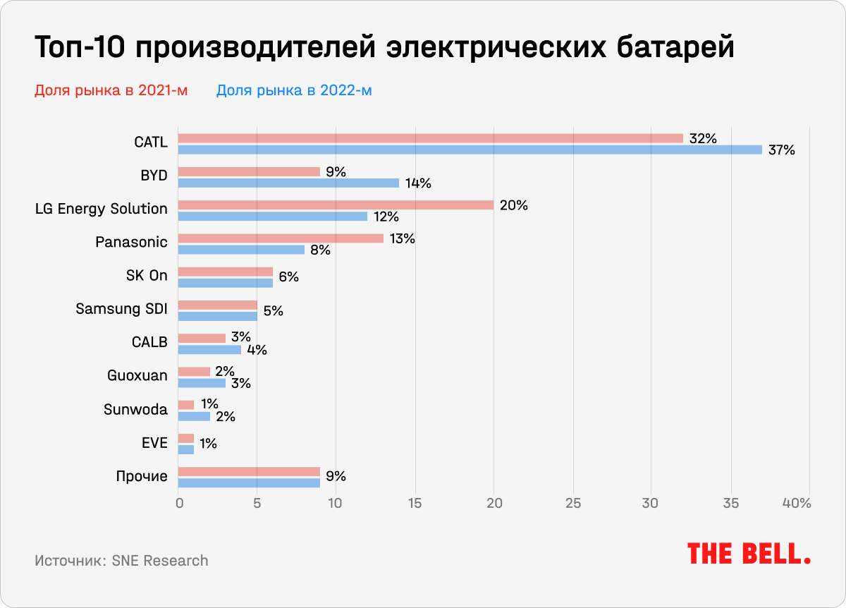 Большинство производителей аккумуляторов базируются в Китае и Южной Корее и торгуются на местных биржах, зачастую не предоставляя отчетность на английском языке. При этом доля рынка двух крупнейших производителей батарей, китайских компаний CATL и BYD, по данным с января по ноябрь 2022 года, составляла 50,7%.