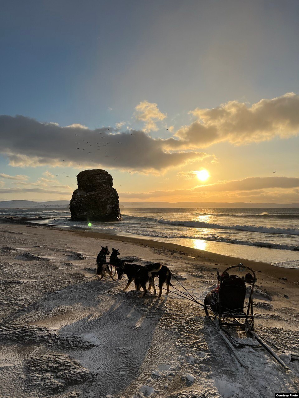 – Как только погода наладилась, мы решили сначала встретить рассвет у океана, а потом пойти на разведку. Встали пораньше, запряглись и отправились к берегу второго Курильского пролива. Собаки впервые встретились с океаном, как ни странно. На Камчатке и море, и океан, а мои собаки увидели большую воду только на Курилах – хотя бы ради этого надо было полететь.