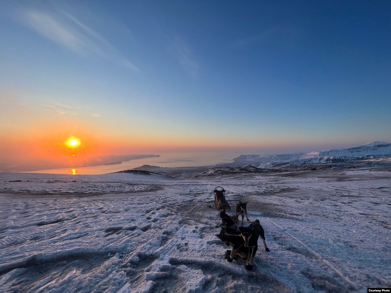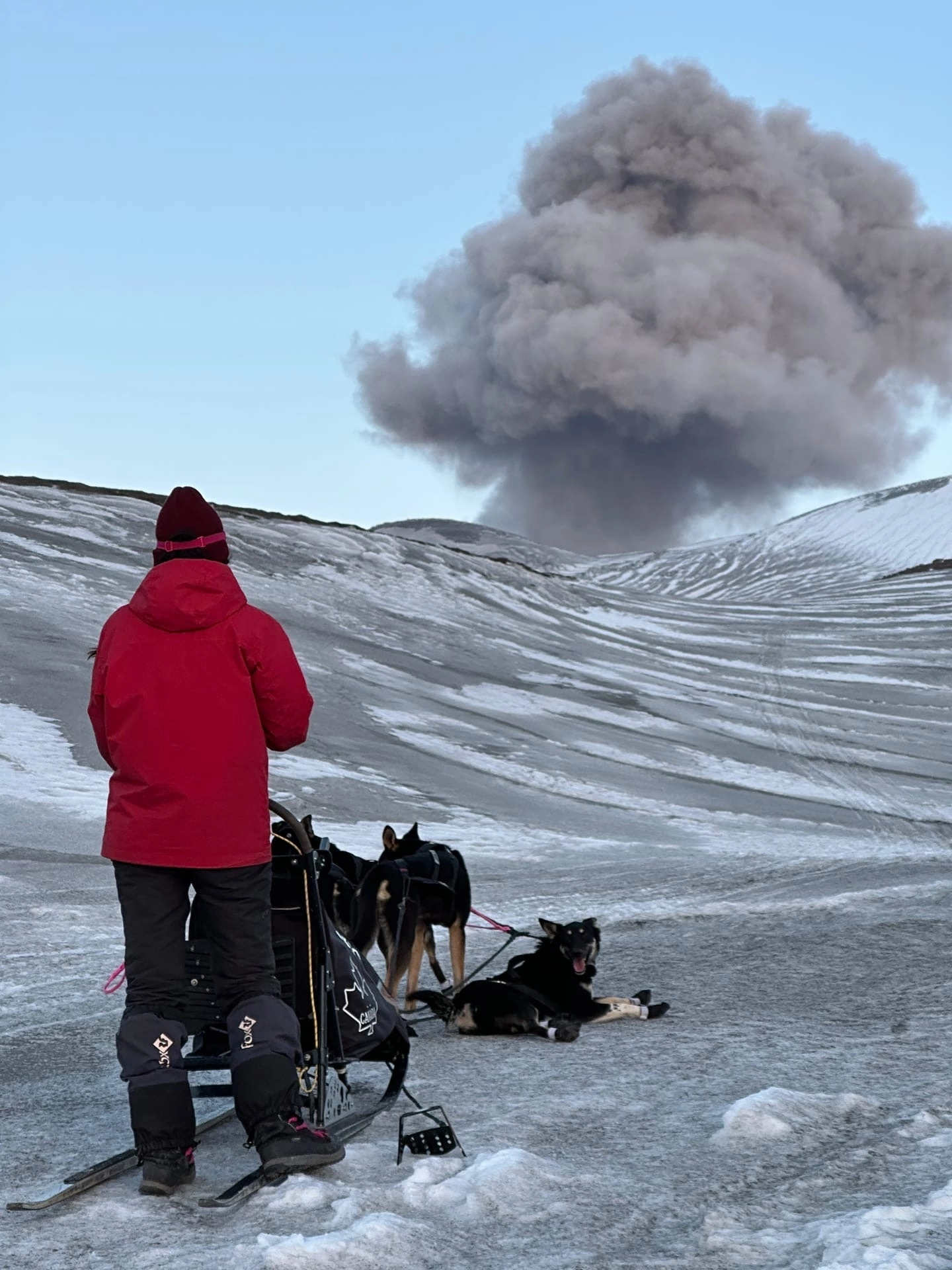 – Мы переживали, что придется уехать, так и не поднявшись на вершину– на следующий день у нас был вертолет в 11 утра. Но все равно повторили вылазку – встали в четыре утра, в пять начали восхождение, в семь уже были на вершине. Погода была идеальная, но снег был покрыт слоем пепла. Иногда мне приходилось помогать собакам, потому что моя нарта плохо скользила по пеплу. Нужно было где-то толкать, где-то бежать вместе с ними за нартой, чтобы их не перегружать.