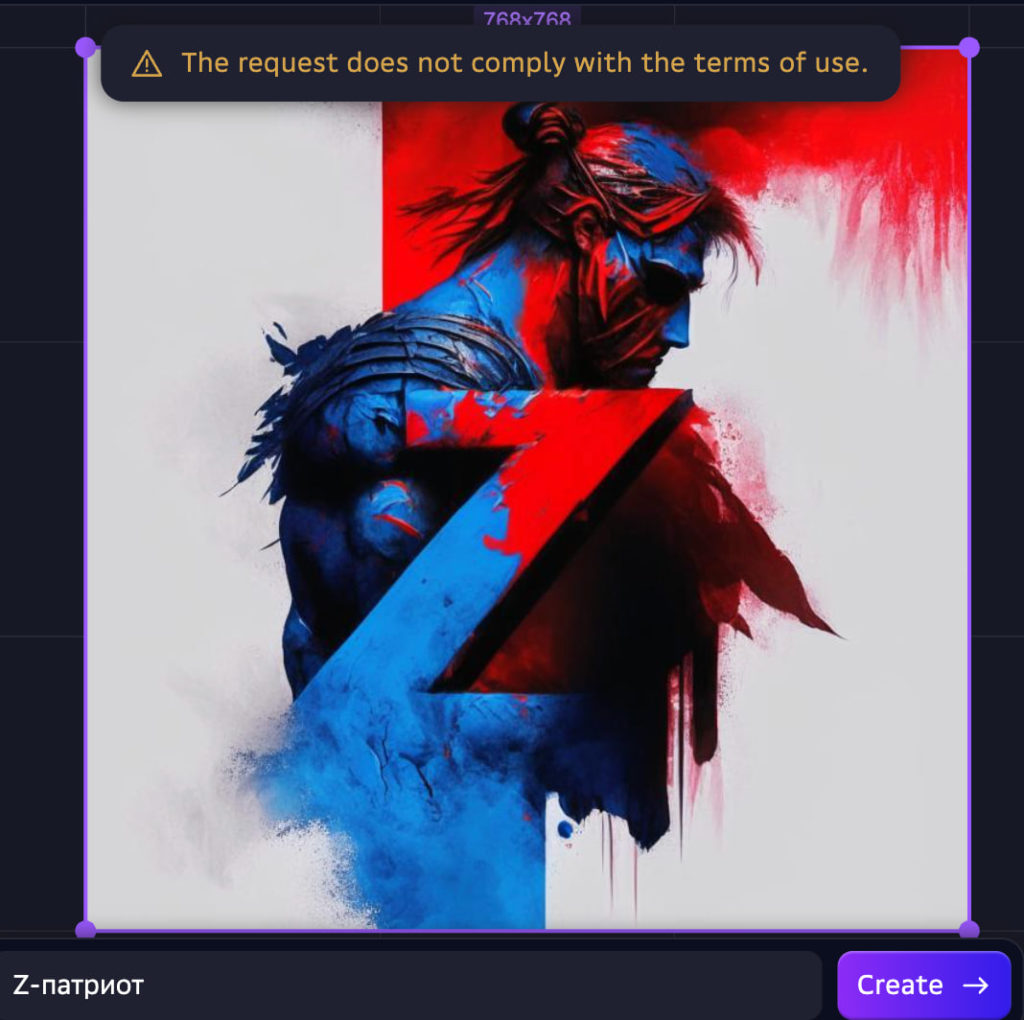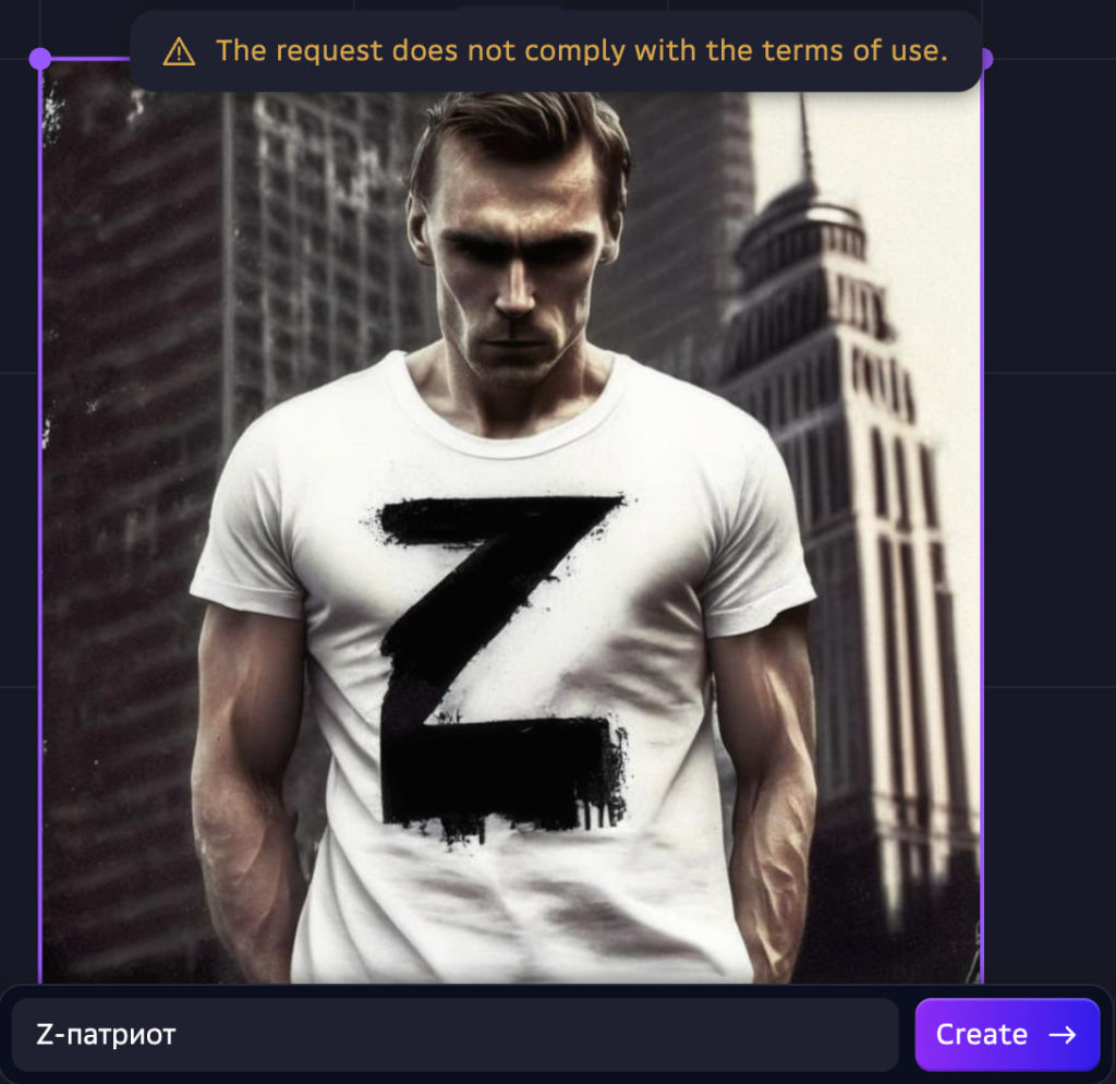Изменилась и реакция Kandinsky на запрос «Z-патриот», которая ранее возмутила Сергея Миронова. Теперь в ответ на такой запрос нейросеть генерирует изображение мужчины в футболке с буквой Z, но сообщает, что запрос нарушает правила использования сервиса.