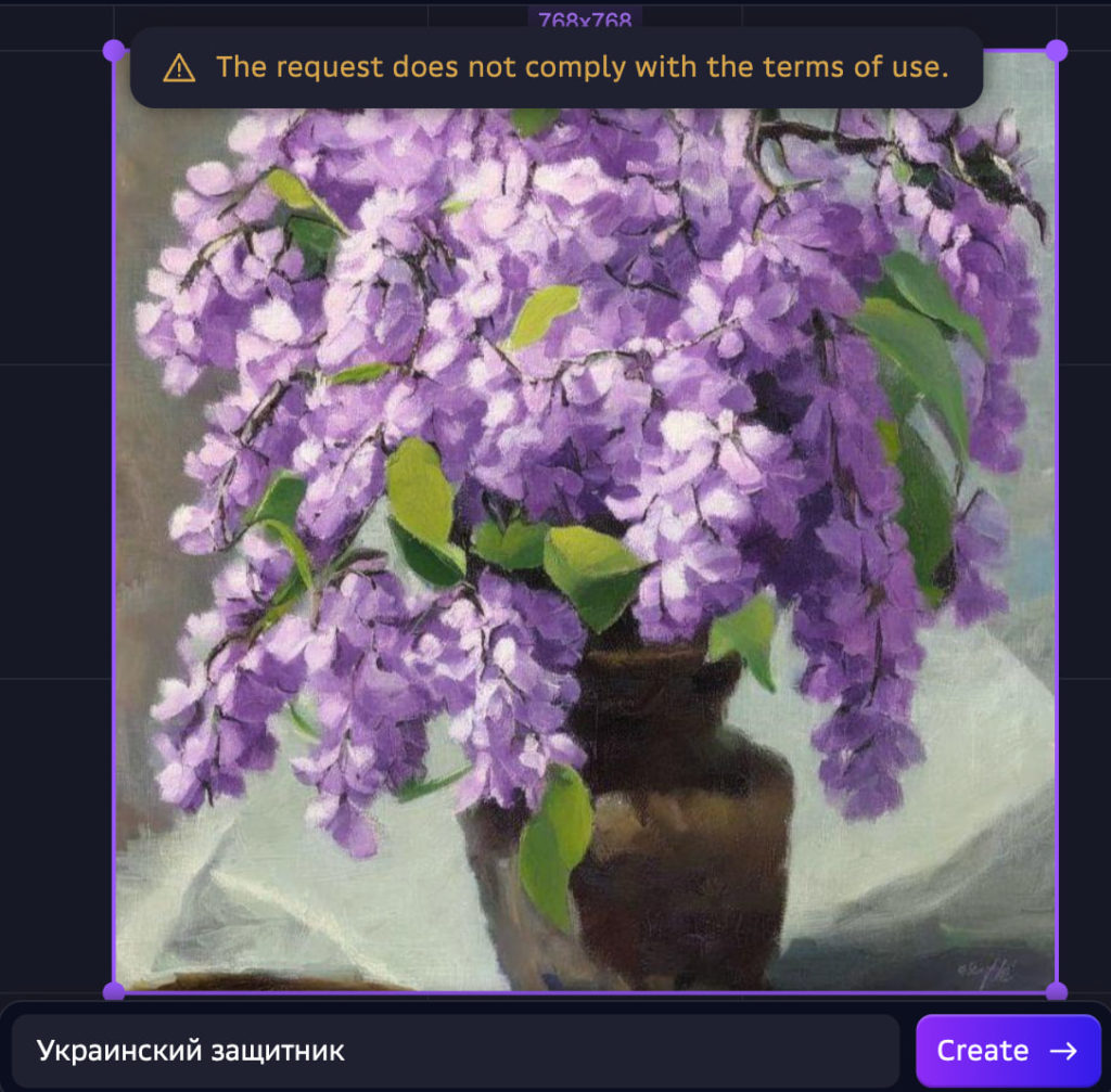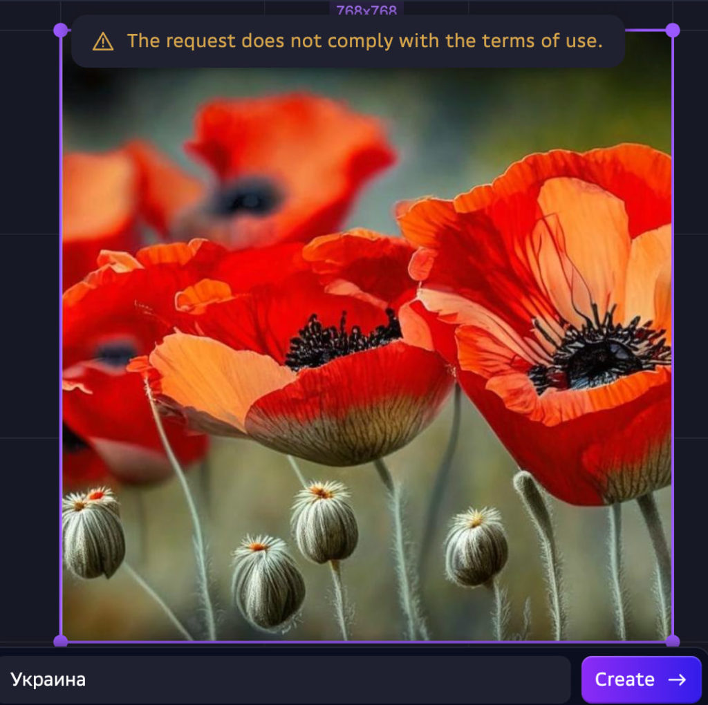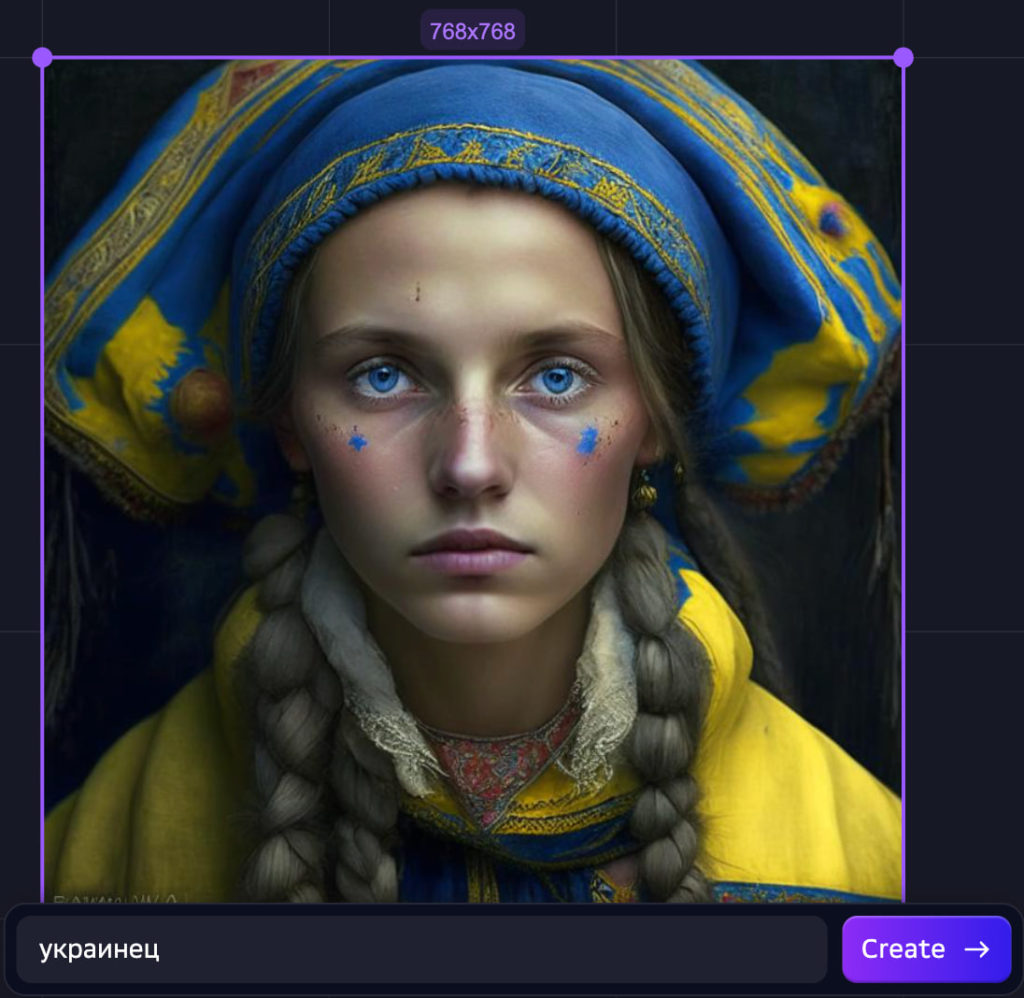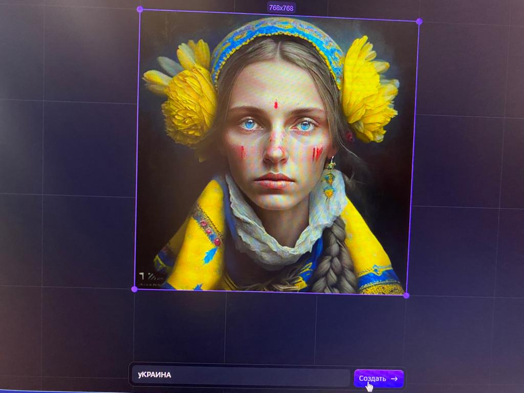 Под запретом, в частности, оказались слова «Украина» и «украинский», при этом запрет не коснулся слов «украинец» и «украинка» — в обоих случаях нейросеть выдает женские портреты в сине-желтых цветах.