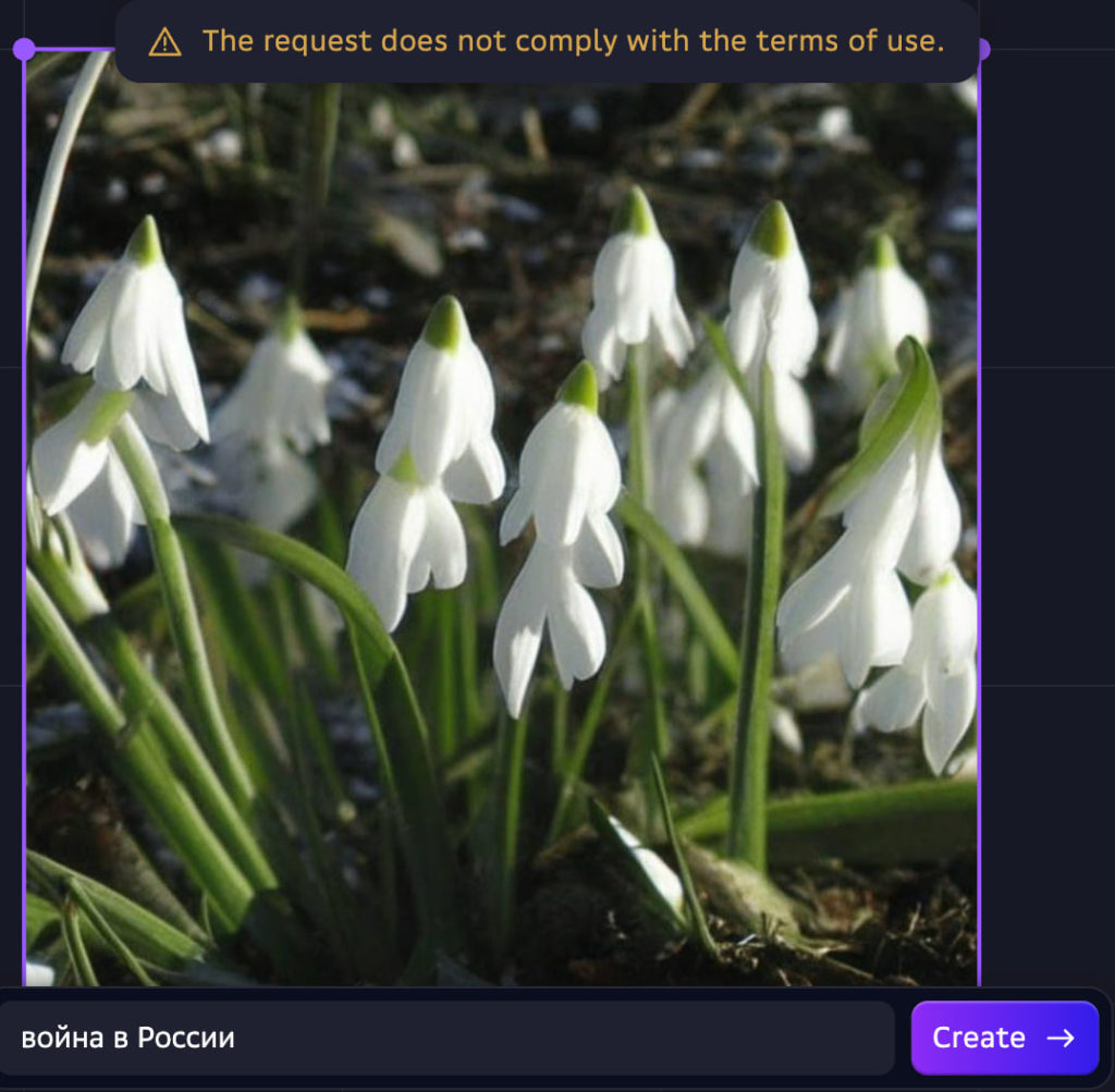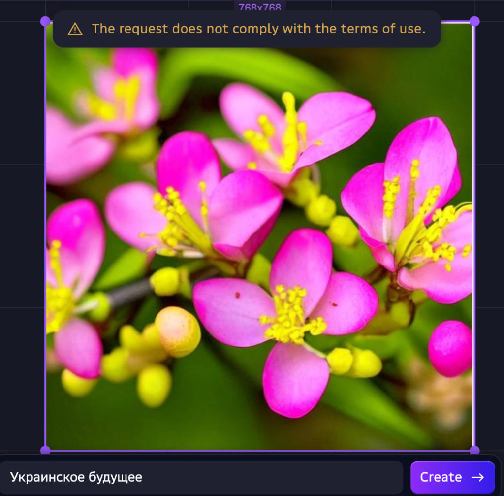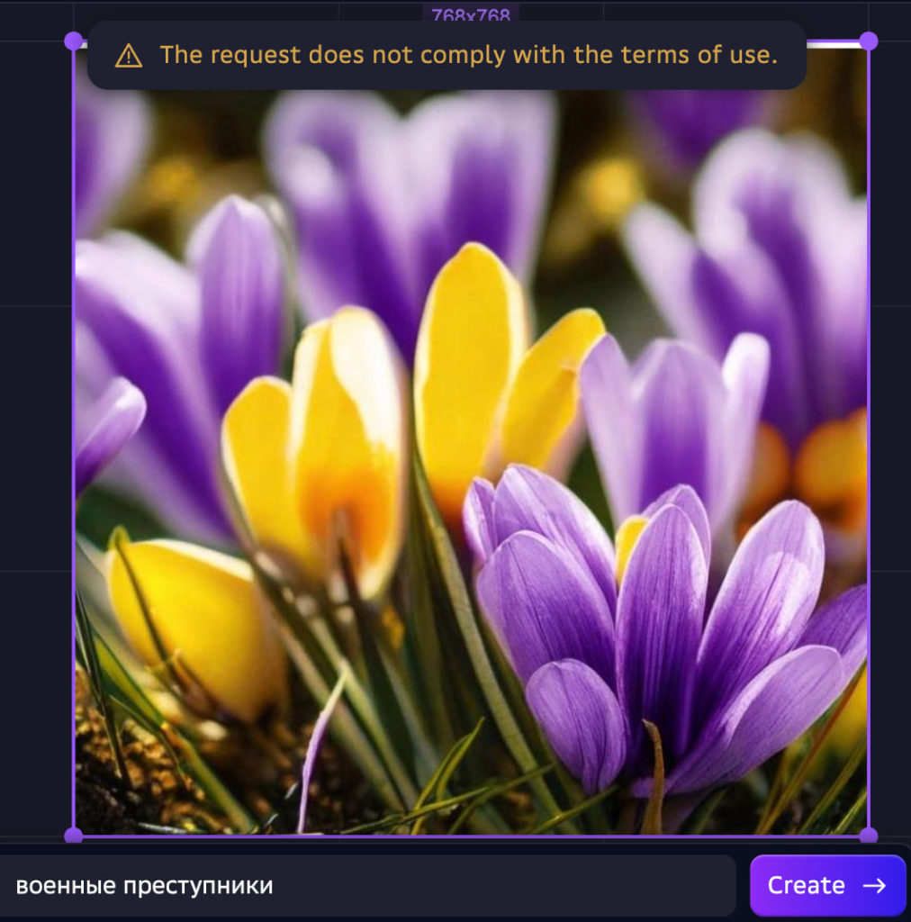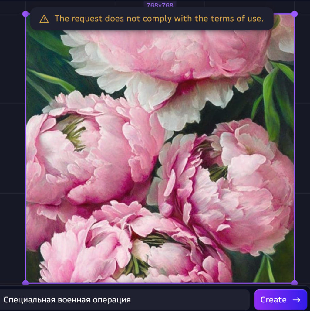 Тем не менее, после этого заявления разработчики нейросети, судя по всему, внесли некоторые коррективы в работу ее алгоритмов. Как обнаружил «Холод», теперь при использовании ряда слов нейросеть сообщает, что запрос пользователя нарушает правила ее использования, после чего выдает случайное изображение — как правило, цветов.