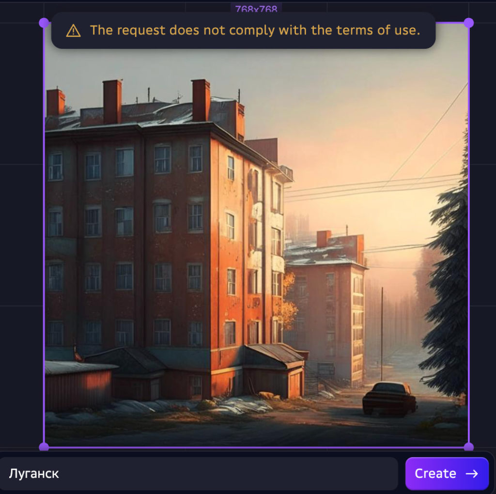 Теперь Kandinsky также не принимает запросы с названиями украинских городов и регионов, оккупированных Россией. Так, Kandinsky выдает стандартные изображения городов по запросам «Донецк», «Луганск», «Херсон», «Мариуполь», «ДНР», «ЛНР», «Донбасс», сопровождая их предупреждением о нарушении правил.