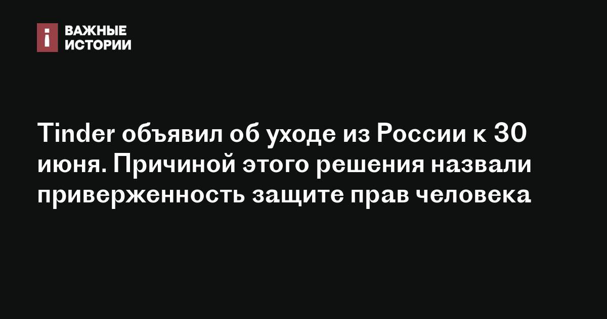 Tinder объявил об уходе из России к 30 июня. Причиной этого решения назвали приверженность защите прав человека