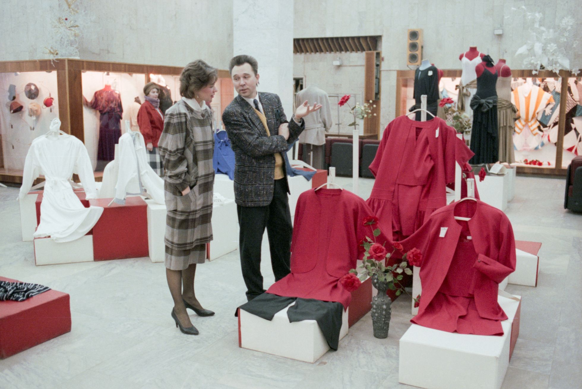 Вячеслав Зайцев на показе коллекции одежды на ивановской ярмарке «Женское творчество и предпринимательство». 1995 год