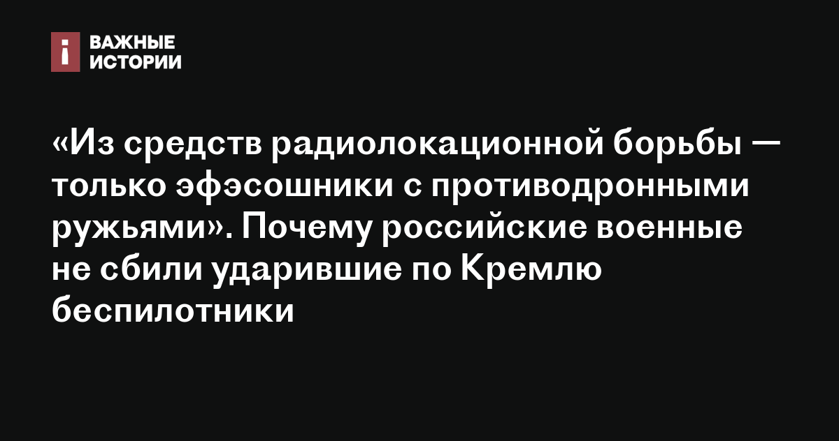 Поддержите «Важные истории» Мы рассказываем вам правду о войне России против Украины. Благодаря вашей поддержке мы сможем продолжить работуПоддержатьВ начале 2023 года военные начали создавать систему ПВО непосредственно в Москве, в частности в центре города появились установки «Панцирь-С1». Однако Михайлов считает, что новая система «не отработана». «Судя по тому, что какие-то непонятные чуваки лезут на купол перед прилетом, есть ощущение, что все средства радиолокационной борьбы заключаются в эфэсошниках с противодронными ружьями», — говорит эксперт. По его словам, у России нет интегрированной системы ПВО, а военным не хватает опыта: «Когда человек на радаре засекает цель, после чего кто-то звонит эфэсошникам и они лезут на крышу с дронобойками, — это не интегрированная система ПВО, это херня».