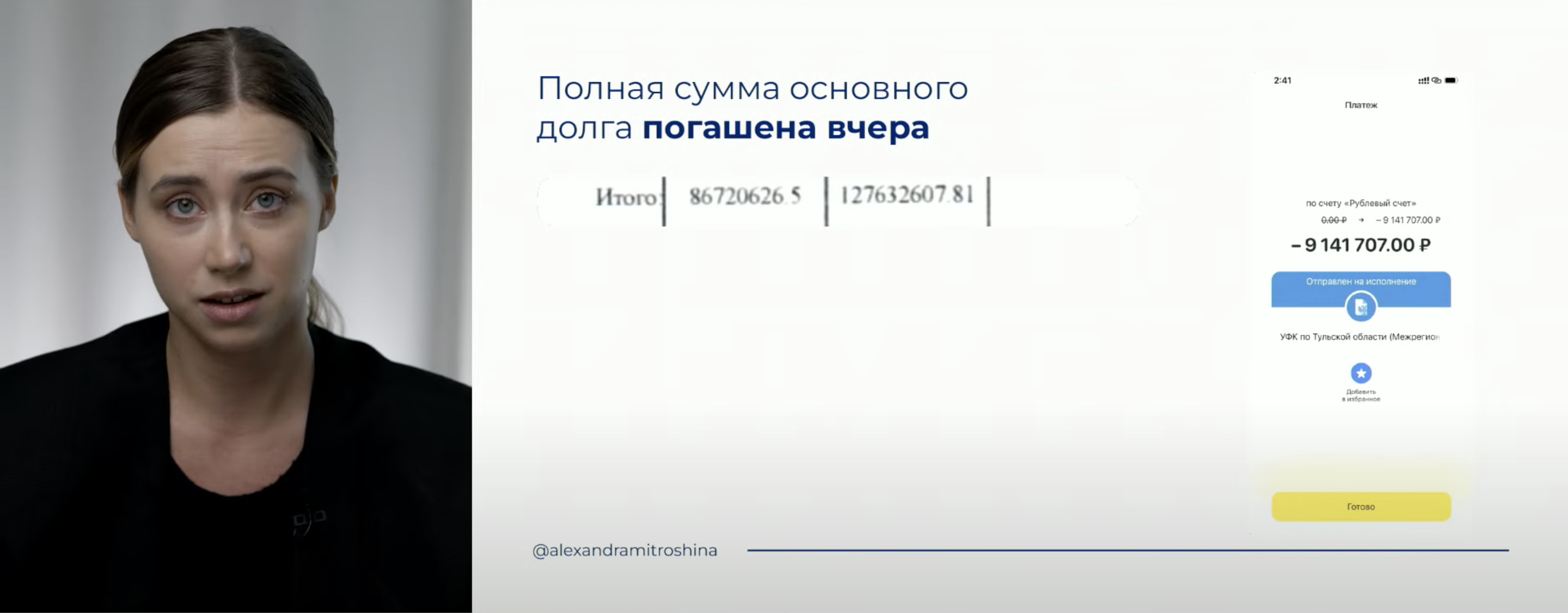 По словам Митрошиной, она в течение «двух-трех дней» после возбуждения уголовного дела заплатила «большую часть» суммы, почти 120 миллионов рублей, а ко 2 мая «погасила основную сумму долга» cо штрафом — все 127 миллионов рублей. При этом в апреле адвокат Митрошиной Алиса Волхова отрицала сообщения о выплатах налоговой.