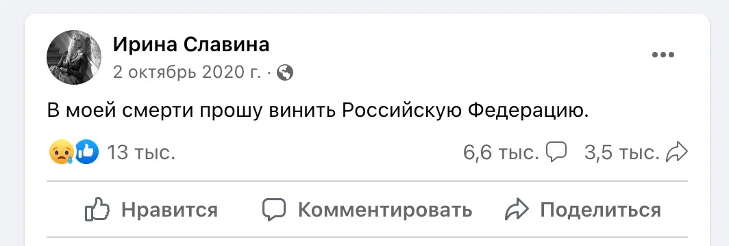 В середине дня 2 октября Славина пришла к зданию полицейского главка в Нижнем Новгороде, к скульптуре «На страже закона», героизирующей правоохранителей всех времен, и подожгла себя. В посмертной записке она написала: «В моей смерти прошу винить Российскую Федерацию». Уголовного дела о доведении до самоубийства никто не возбуждал. Дочь Ирины, Маргарита Мурахтаева, позже вышла на одиночный пикет с плакатом: «Пока моя мама горела заживо, вы молчали». Сайт издания Koza.Press некоторое время поддерживали муж Ирины и ее коллеги, но с февраля 2021 года он не обновляется. Тем не менее, российские власти не забыли лишить его лицензии СМИ. Ирина Тумакова поговорила с дочерью Славиной о том, как она видит свое будущее в стране (несмотря ни на что, Маргарита хочет заниматься журналистикой) и когда это будущее наступит.