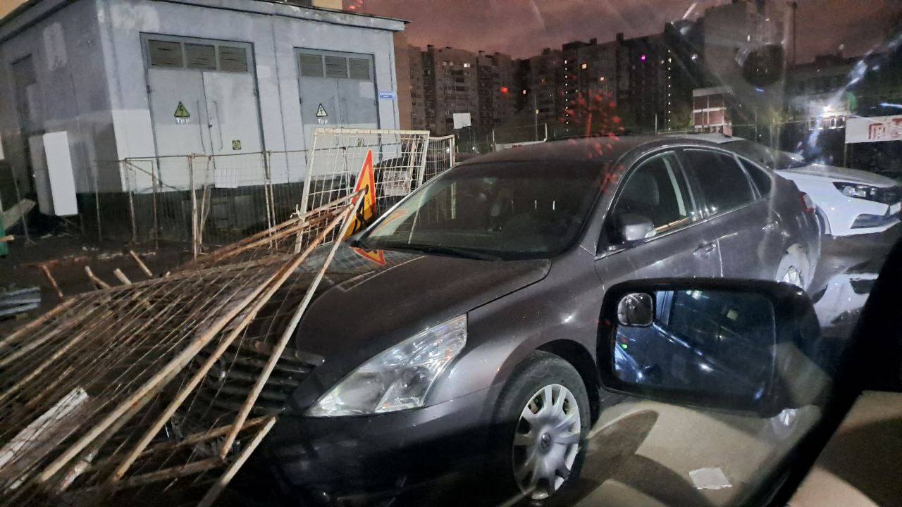 Во дворе на Камышовой улице ограждения ветром снесло на припаркованные машины.