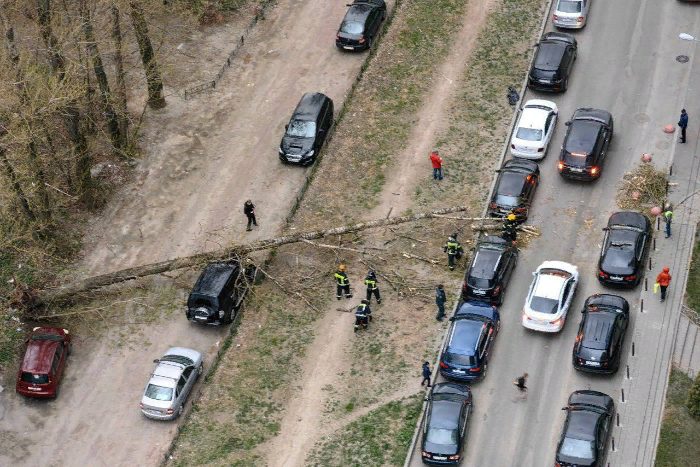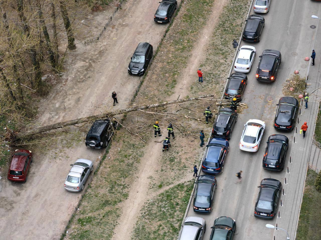 У ЖК «Речной» в Рыбацком дерево упало на припаркованные машины — повреждения, по словам очевидцев, получили не менее четырех автомобилей.