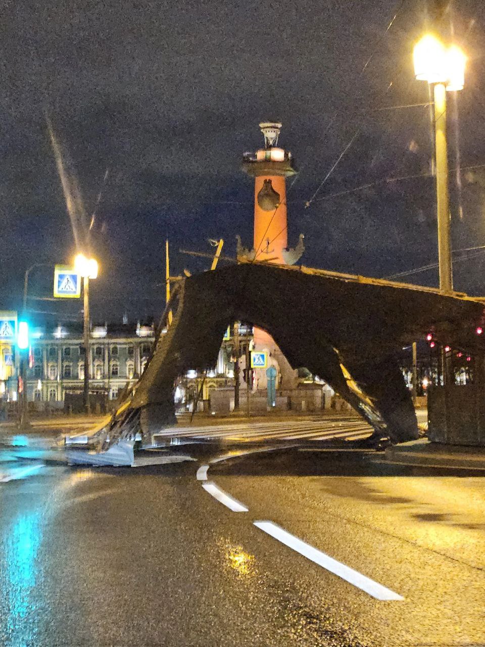На Стрелке Васильевского острова обрушились строительные леса. Как отмечает «Коммерсантъ», леса снесло со здания Биржи.