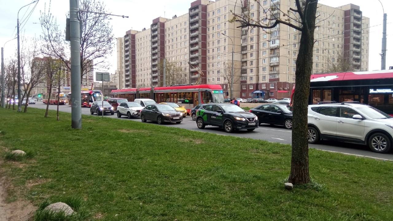 На проспекте Обуховской Обороны оборвался провод, из-за чего вечером 2 мая образовалась пробка из трамваев.