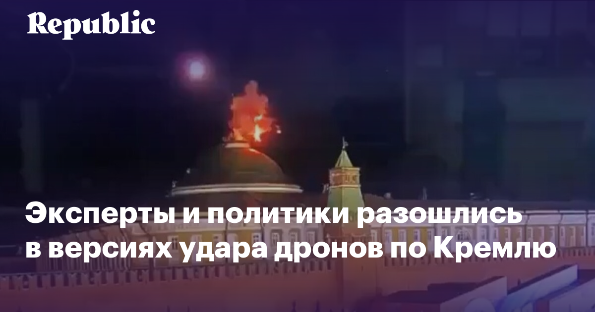 В ночь на 3 мая два беспилотника атаковали кремлевскую резиденцию Владимира Путина. Как минимум один дрон, судя по опубликованным видео, упал на купол Сенатского дворца, где находятся рабочие кабинеты и квартира президента РФ. Самого Путина в этот момент в Кремле не было, утверждает его пресс-секретарь Дмитрий Песков. Тем не менее, российские власти заявили, что произошедшее было «покушением» на главу государства и обвинили в этом Украину, возбудив уголовное дело по статье о теракте. В Киеве утверждают, что не атакуют «ни Москву, ни Путина». Кто именно организовал атаку — до сих пор неизвестно, версий на этот счет несколько: начиная от провокации и инсценировки со стороны самого Кремля до реального удара, за которым стоят ВСУ. Что по этому поводу говорят военные эксперты, политики, социологи, экономисты и политологи, — в обзоре Republic.