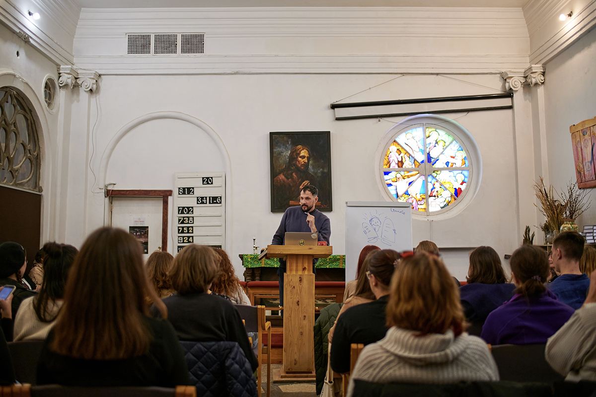 Одна из лекций 16-го потока курса проходит в часовне сразу после воскресного богослужения. В небольшом пространстве с маленькими круглыми витражными окошками на втором этаже Анненкирхе – аншлаг, пустых мест нет. Среди слушателей преимущественно молодые люди. Лекцию ведет Евгений Раскатов, переодевшийся после службы в синий свитер, из-под которого виднеется пасторский воротничок, и темно-синие брюки. Он зачитывает фрагменты Писания, а затем рассуждает об этом с аудиторией на более доступном языке. Из-за непринужденной атмосферы иногда лекция походит на христианский стендап с шутками и анекдотами.