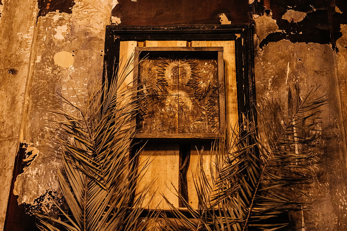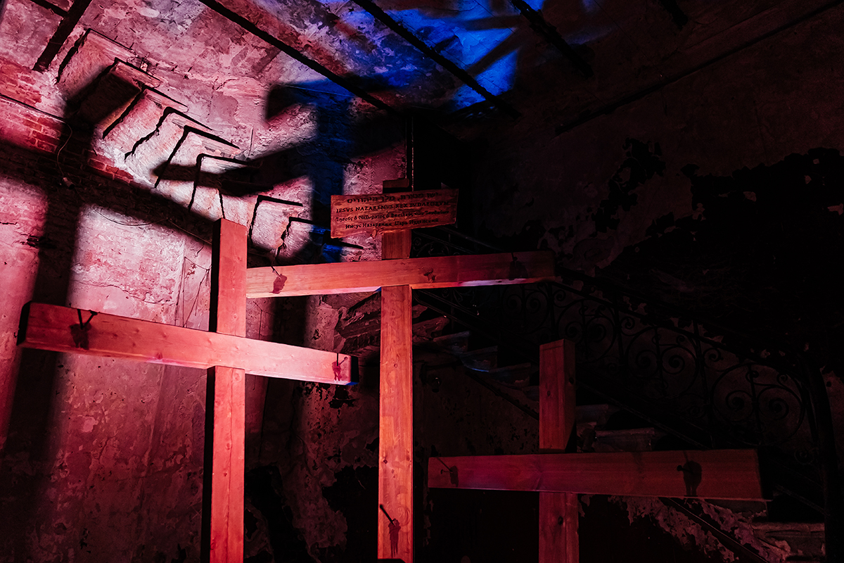 В большом зале идет воскресная служба. Помещение вместило в себя одну из главных экспозиций выставки: по периметру зала развешаны картины с изображением Христа – распятого, несущего крест. В центре, над головами собравшихся, расположен огромный терновый венец-корона – тоже часть инсталляции. Через большие окна солнце заливает зал богослужения светом.